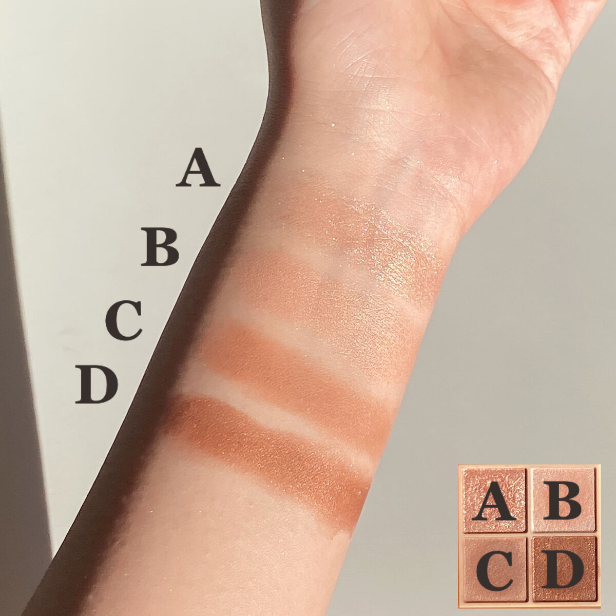 - ラメ・パール・マット3質感の4色アイシャドウ。 肌馴染みの良いベージュを基調としたカラー。ラメ・パール・マットの3質感を重ねて、自然にまぶたを強調し奥行のある大きな目元へ。 しっとり溶け込むような柔らかなパウダーなので、スルスル伸びてまぶたにピタッと密着。保湿成分(スクワラン・ホホバ種子油)配合。