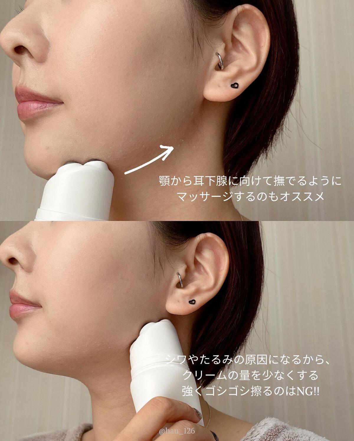 公式ストアにあった方法でマッサージしてみました♪ 鎖骨まで流すとよりスッキリとする感じが♡ しっとりながらベタつかないエッセンスクリームも このアイテムにぴったりのテクスチャーです。