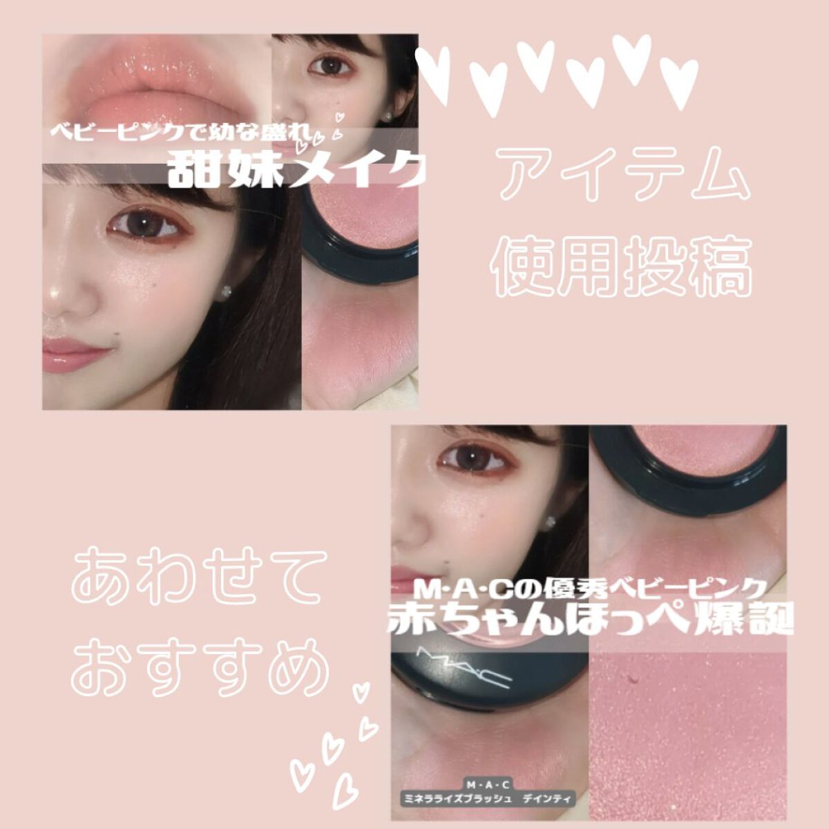 ベビーピンクのほわほわパウダーの中にゴールドラメもはいってて自然な艶も出してくれます🫶 M・A・Cのこのシリーズは発色がとてもいいのでブラシでふわっと乗せるだけで〇 肌なじみが良いのでナチュラルな可愛い系メイクにおすすめです😊♡ 特にブルベ夏さんが似合いそうですが、薄づきで使用するなら誰でも合いそうなベビーピンクチークです😊 1つ前の投稿で紹介した流行りの甜妹メイクにも使用したこちらのチーク、本当にナチュ幼なかわほっぺにできるのでぜひ試して見てください♡