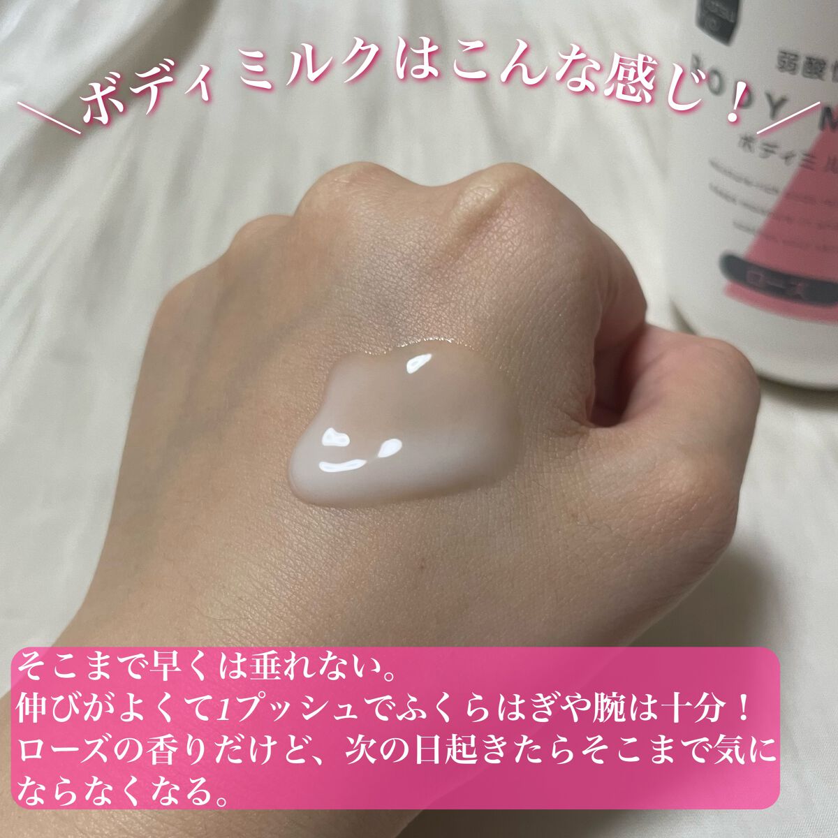私がリピートしてるボディミルクです🥺💕 乳液みたいになめらかで伸びが良くてベタつかないのが良いところです◎ 保湿力もやや乾燥肌の私には全然問題なく乾燥せずに使えてます😌 あと、価格が500円代と安くて惜しまずに使えるし、使い続けられるのがいいなと思いました☺️ 無香料を使ってますが 他にもフローラルやローズの香りがあるので好きな香りを楽しめますよ🤍