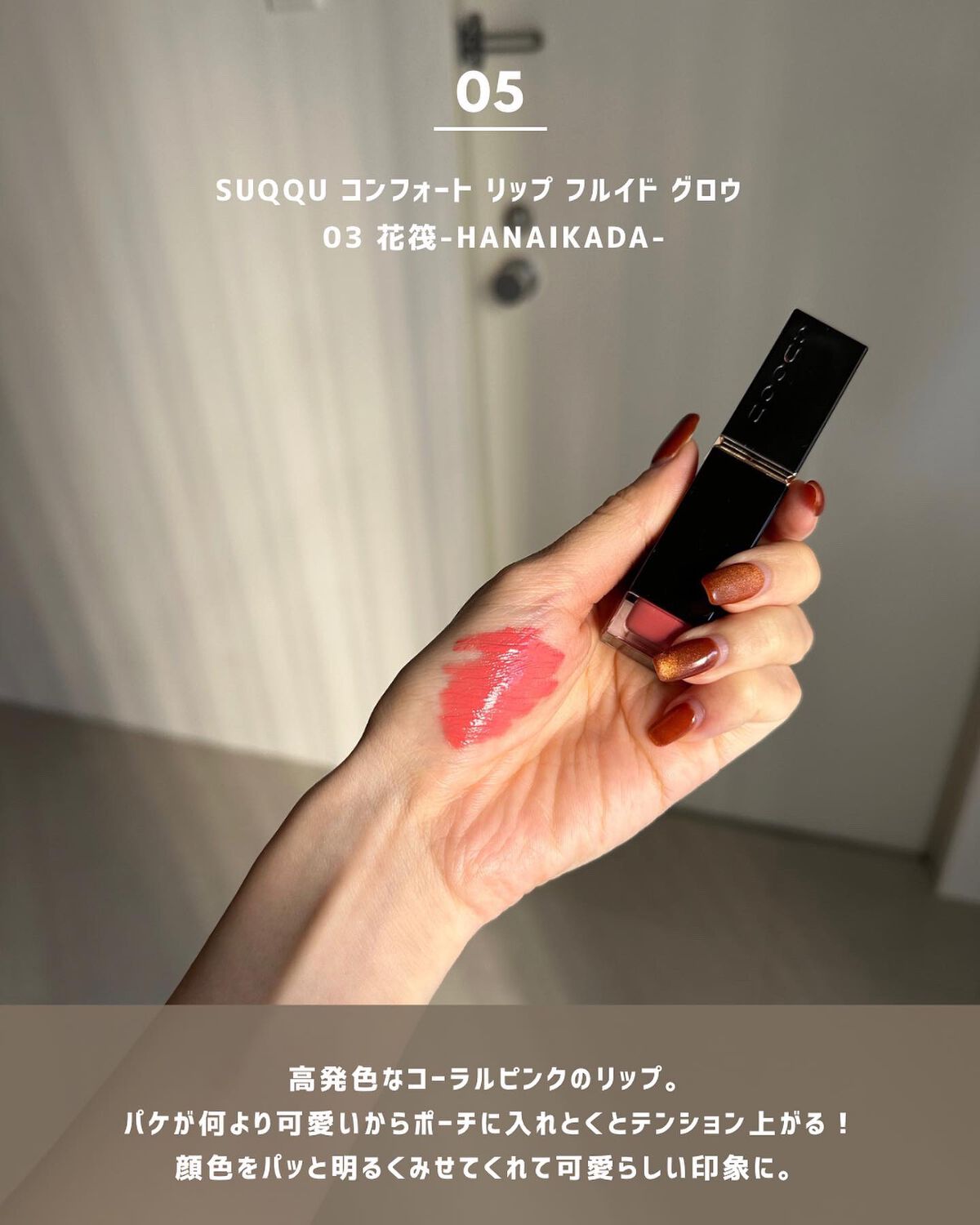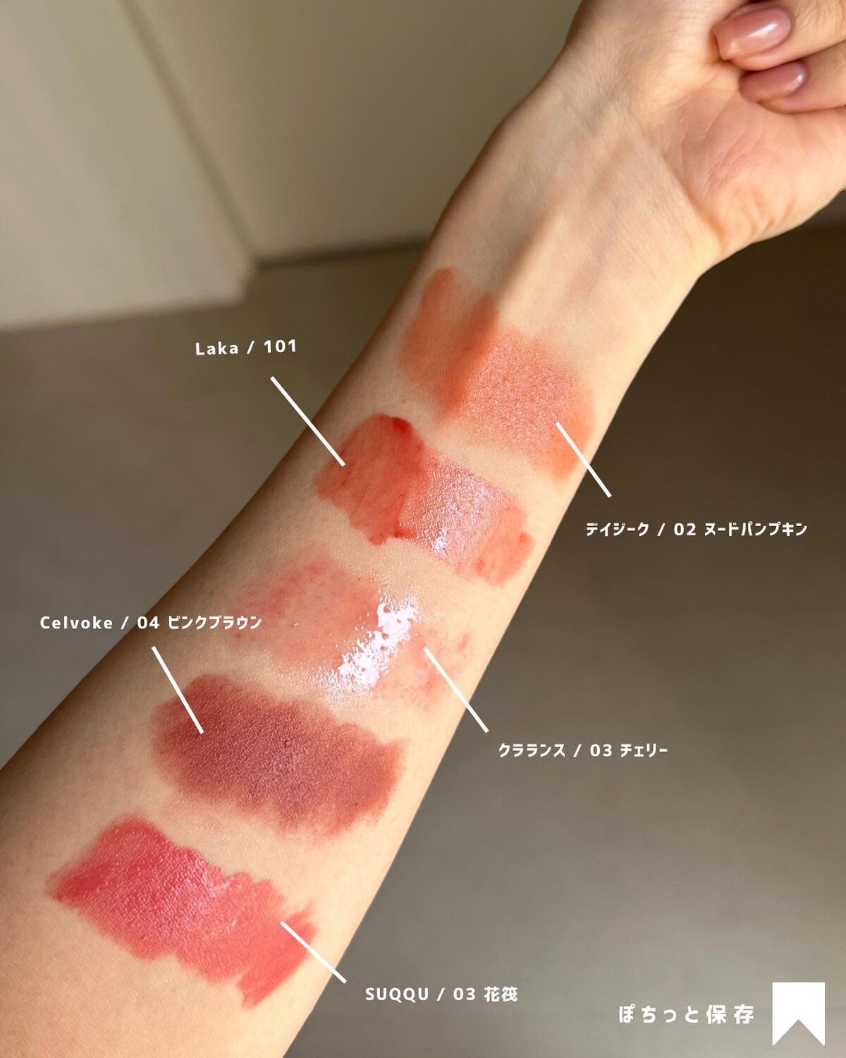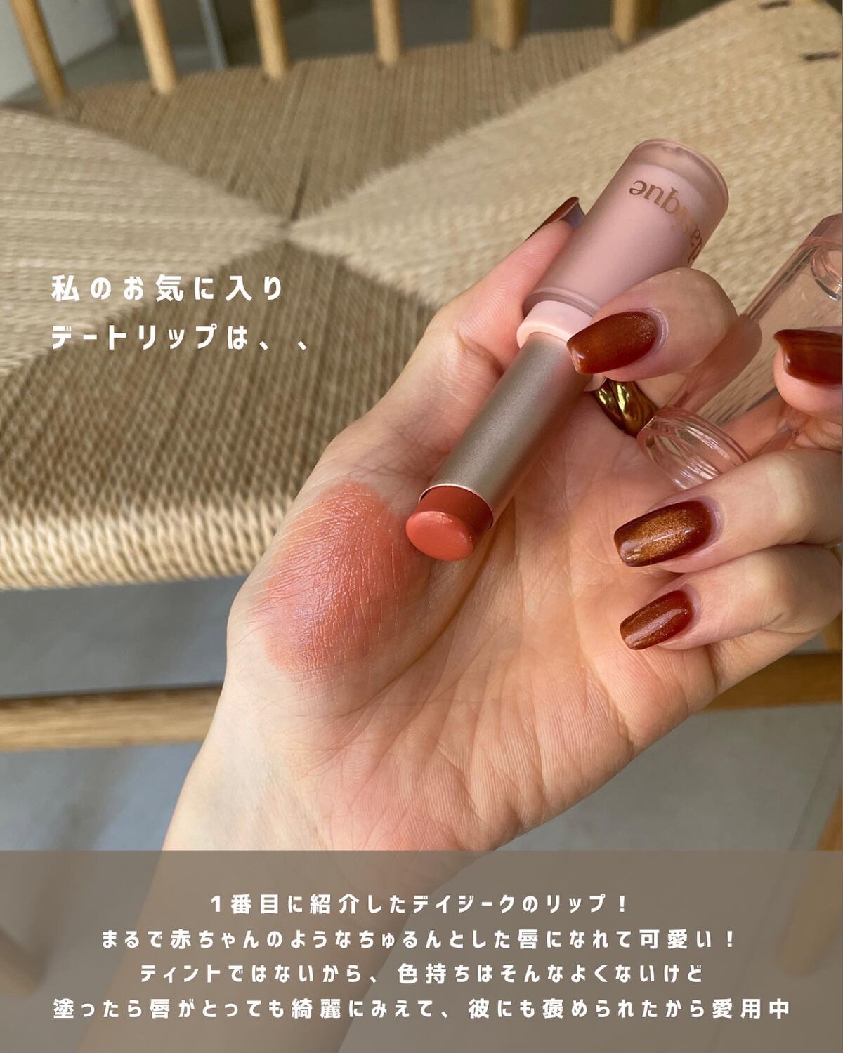 | さらっと塗れて、 唇にフィットしているような質感。高発色でベタつかず、キレイなツヤが出ます✨ . | 詳細を見る |