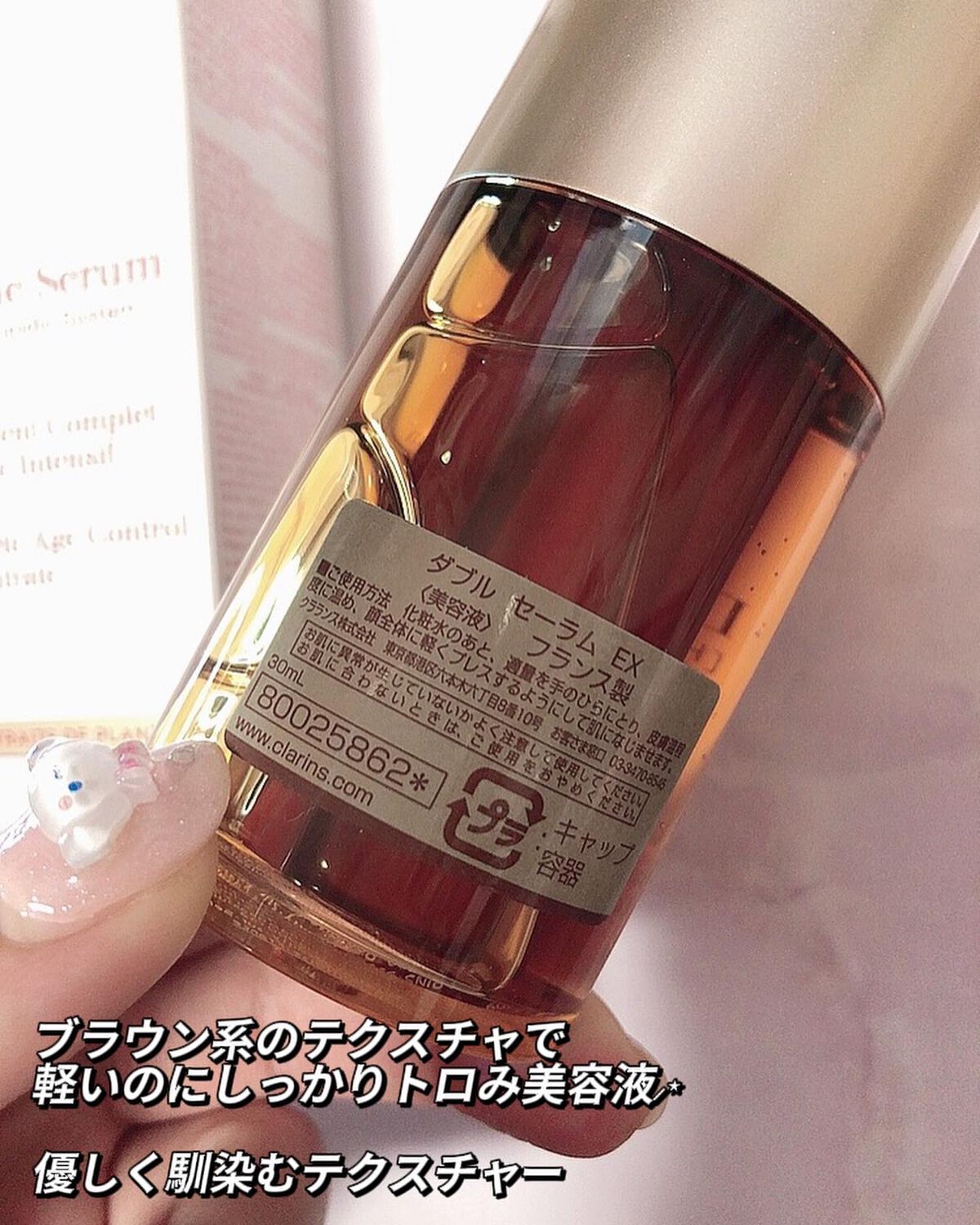 - コスメ賞を多数受賞するクラランスNo.1美容液。 20種類以上の植物由来成分が配合された、オイルxウォーターのダブルフェイズのエイジングケア美容液。すべての肌タイプに対応し、パワフルにケアします。 すばやく肌*に浸透し、肌を引き締め、ハリ・弾力感のある活き活きとした肌へ。 オイルセラム(油溶性)と、ウォーターセラム(水溶性)を容器内部で分けているため、使うたびにフレッシュなまま肌に届きます。 *角質層