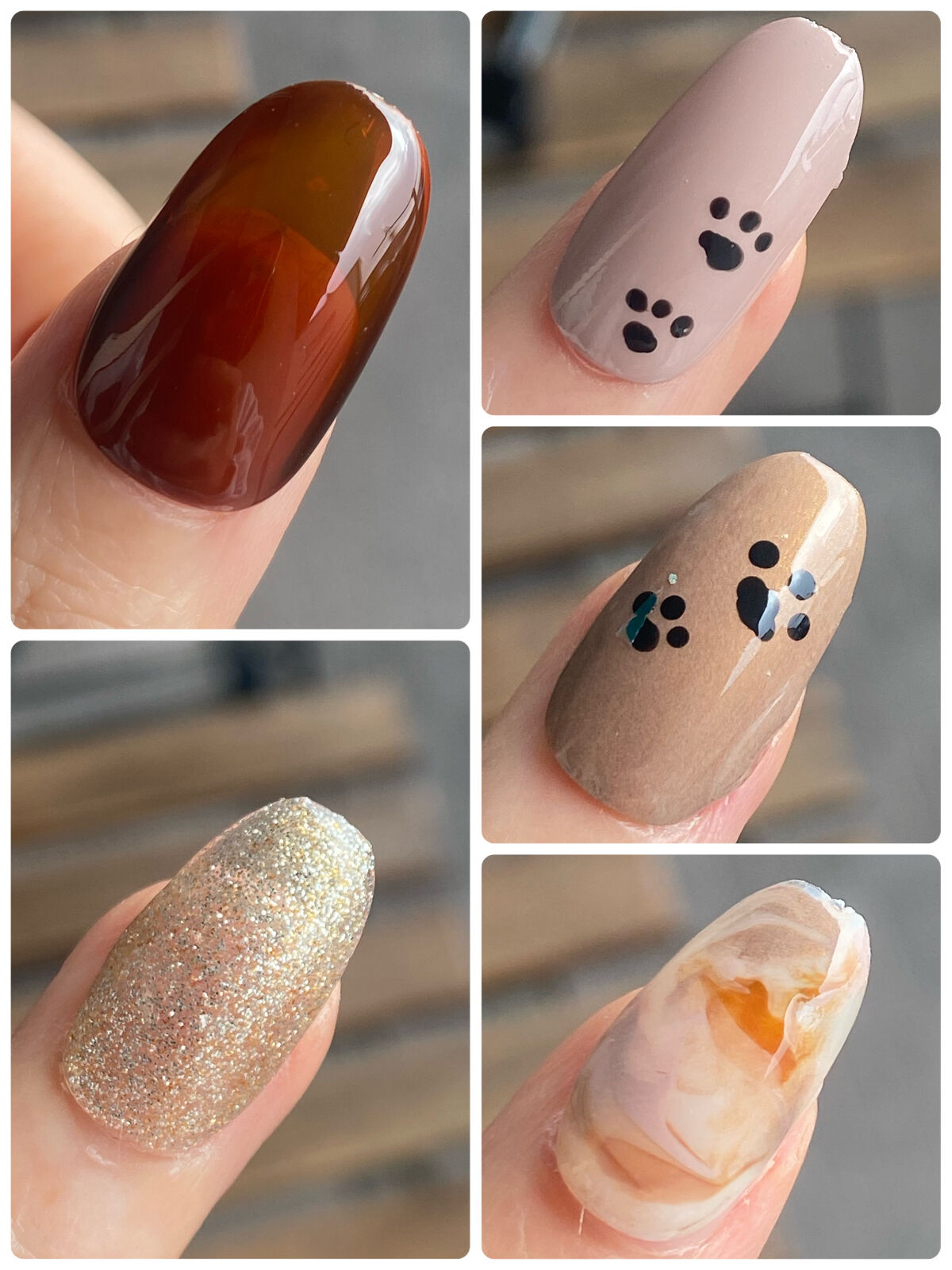 rom&nd ムードペブルネイル【09 AMBER】が、透け感強め+みたらしカラーで可愛いです。 個人的に、うおおおお!!?😍ってなったのは【N20 ゴールデンビジュー】の上に【09 AMBER】を重ねた瞬間です。 秋?の限定カラーだった【N110 木枯らし】は赤みを感じるブラウンで透け感あって、すごく可愛いのでオススメです!