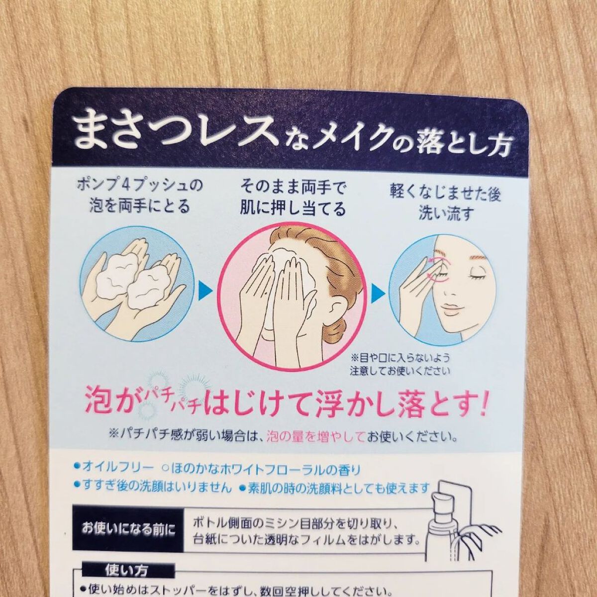 泡がパチパチ弾けて浮かして落とす、泡状のまさつレスなメイク落としです🫧 オイルフリー w洗顔不要 素肌の時の洗顔としても使える 優しくほのかなホワイトフローラルの香りに癒される🤍 顔全体に広げたら、あとは包み込むようにプッシュする。この使い方が新しくて驚き😳👏 擦らずに抑えるだけで本当に落とせるのかなぁ。。。と、とっても疑問だったけど、使ってみて納得💡 しっかり落ちてる…‼️ そして、きちんと落ちてる✨ 洗い流しもスッキリしていて、濃いめのアイメイクも、しっかりオフできてました! ダブル洗顔不要なので、これ一本で大活躍♩