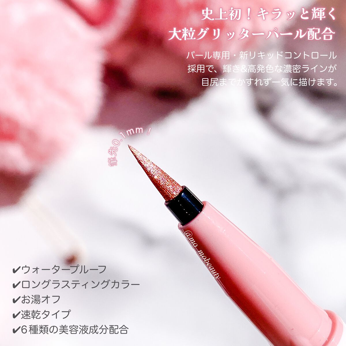 - 派手過ぎず上品に輝く大粒のグリッターパールが、キラめく目元を演出! 夜まで落とさない 超!輝きアイライナーが数量限定で登場 ■史上初※1!キラっと輝く 大粒グリッターパールを配合 派手すぎず上品に輝く大粒グリッターパールが、キラめく目元を演出! ※1ヒロインメイク 筆ペンライナー内で。 ■パール専用・新リキッドコントロール機能を採用 輝き&高発色な濃密ラインが、目尻までかすれずに一気に描けます。 ■筆先0.1mm!なめらか国産極細筆 絶妙なコシのある毛筆だから目尻のハネやまつ毛の隙間など、細部まで狙い通り。 ■夜まで美しく!ウォータープルーフ処方 耐久性の高い成分をオリジナル比率でブレンドした耐久処方。 涙・汗・皮脂・こすれに強く、落とすまで美しいラインをキープします。 ■濃密&高発色!ロングラスティングカラー 伸縮性の高い密着成分をダブルで配合。ピタッと定着し、ワンストロークで色ムラのない、濃密&高発色なラインが描けます。 ■にじまないのにお湯でオフ にじみに強いのに、お湯で簡単にオフ出来ます。 *落ちにくく感じる場合は洗顔料(石けん等)をご使用ください。 ■抜群の速乾性 速乾性に優れ、メイク中のよれ、にじみに、まばたきにも負けません。 ■6種類の美容液成分配合 ・ヒアルロン酸 ・コラーゲン ・野バラエキス※2 ・パンテノール ・リピジュア®※3 ・センブリエキス ※2 カニナバラ果実エキス ※3 ポリクオタニウム - 51