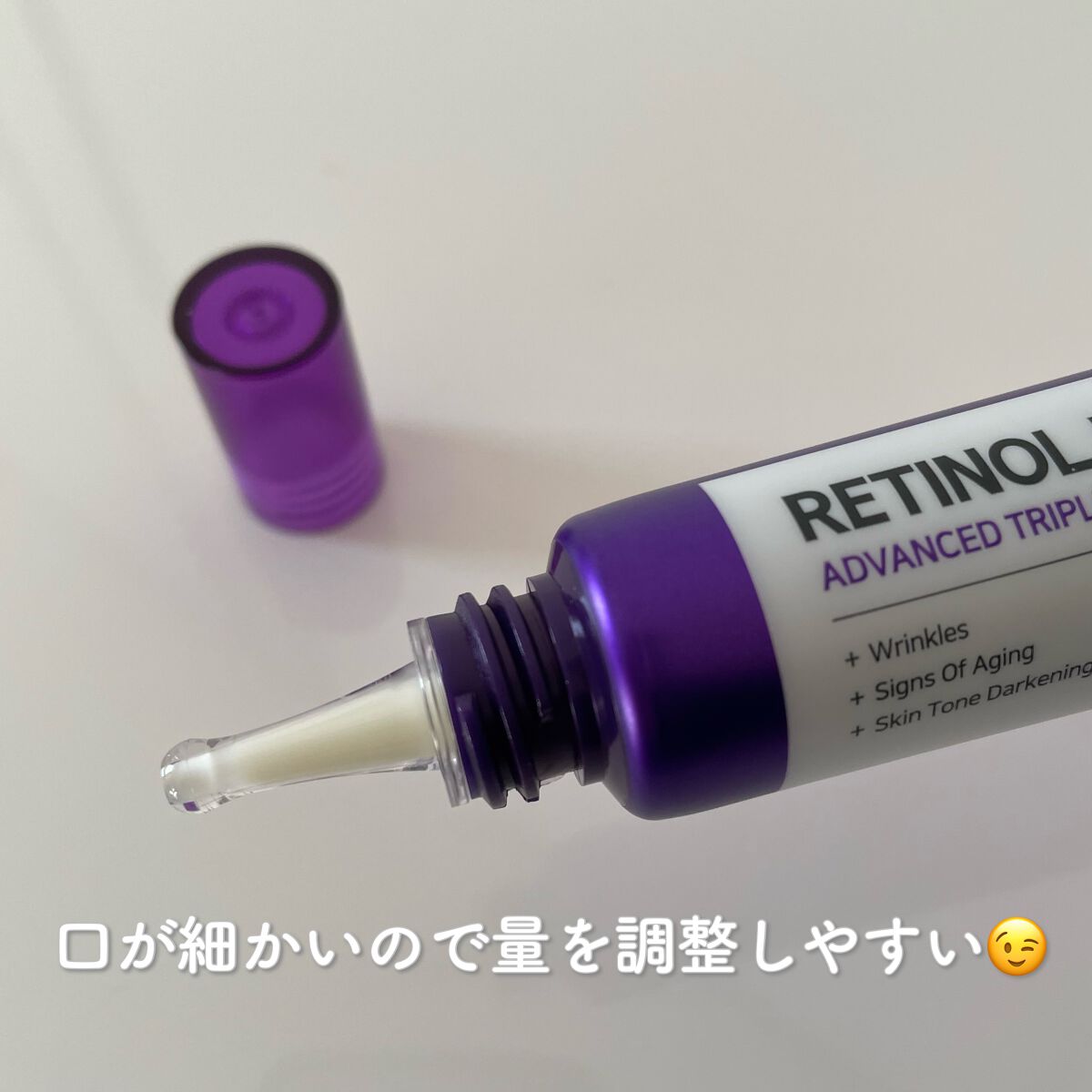 レチノール0.1%+グルタチオン配合で目のくま・小じわを集中ケア 目元以外にも口元や眉間などにも使えて、さまざまなシワ悩みにアプローチしてくれます💜 柔らかくよく伸びるクリームで、結構しっとり感があるような使用感 べたつかずしっかり保湿される使用感なのが嬉しいです💕 この紫パケが特徴的 それぞれの肌に合わせて、使用量などを調整して使うのが大切かなと思います。