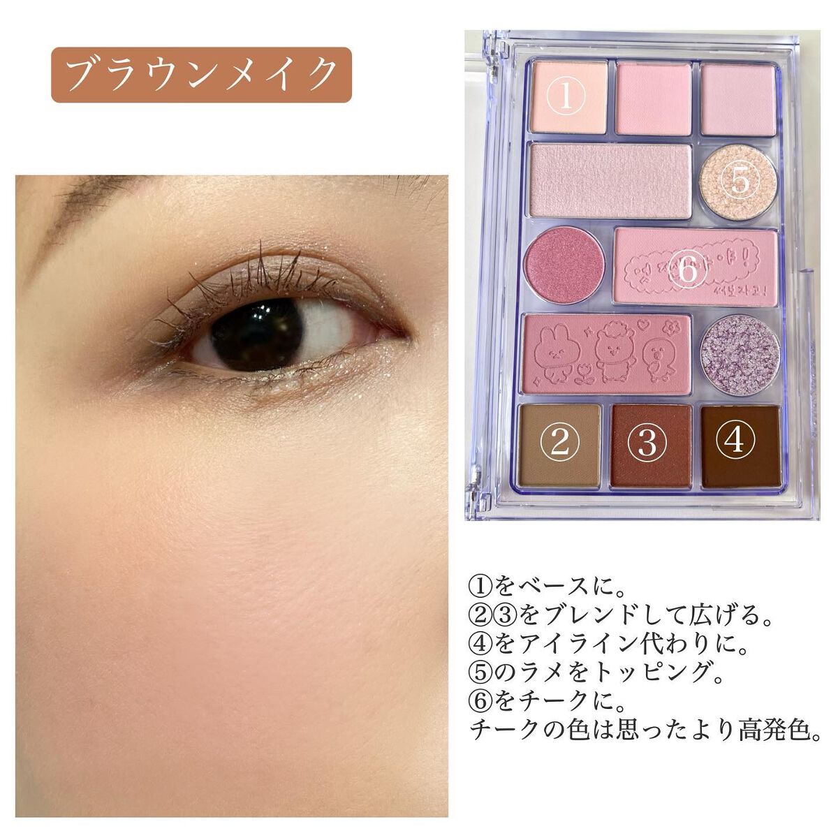 このパレットは、黄味が少なめでブルベにも使いやすいブラウン。 発色はしっかり目だけど、ブラシで調節も可能なので幅広い人に使いやすいパレットだと思います🎀✨ ラメ感も少しずつ異なり、華やかさを抑えたい時は右上を多めに使うと品の良いツヤのあるピンクブラウンメイクになります💎✨ 左上のラメカラーは白っぽいのでどんなアイシャドウとも相性抜群! この可愛い色味と煌びやかなラメは唯一無二です!