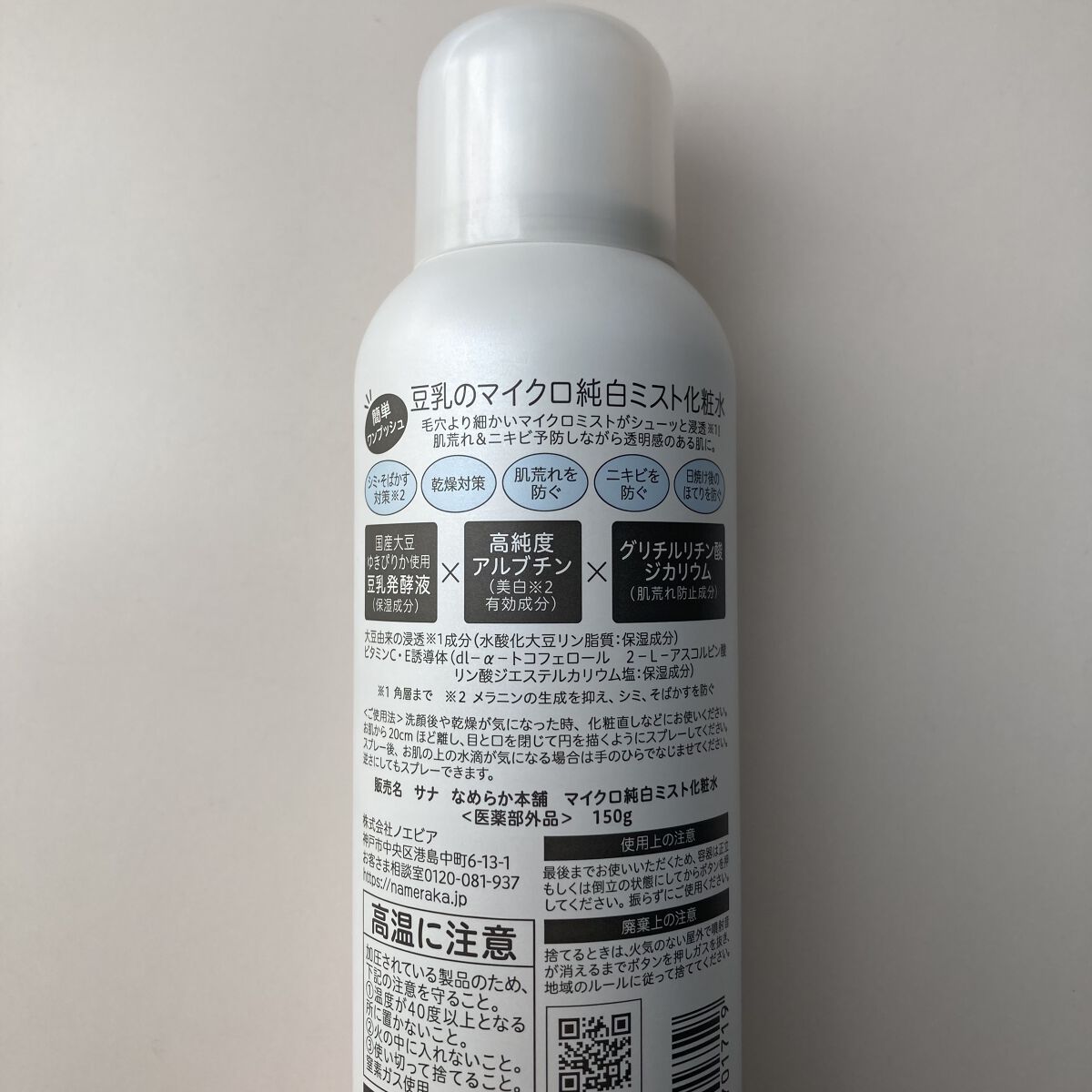 - 【医薬部外品】 ① 肌荒れ・ニキビ予防・美白*2 北海道産大豆「ゆきぴりか」を使用した豆乳発酵液※1 に加え、美白*2 有効成分アルブチン、ニキビ・肌荒れ防止有効成分※3 配合でお肌にうるおいと透明感を与えます。 ② 超微細ミストで導入ケア 毛穴より細かく、肌あたりの良いマイクロミストが角層まで浸透し、うるおいのあるお肌に導きます。 大豆由来の浸透※4成分※5がお肌に必要な油分と水分の両方を引き付けながらうるおいを補給! 化粧水やオールインワンジェルの前の使用がおすすめです。 ③ 全身にもより使いやすく! 倒立(逆さ)での使用も可能になり、背中など全身にも、よりお使いいただきやすくなりました。 ④ こだわりの処方 無香料、無着色、無鉱物油のこだわりの処方。 *2 メラニンの生成を抑え、シミ・そばかすを防ぐ ※1 保湿成分 ※2 セラミドNG(保湿成分) ※3 グリチルリチン酸ジカリウム ※4 角層まで ※5 水酸化レシチン(保湿成分)