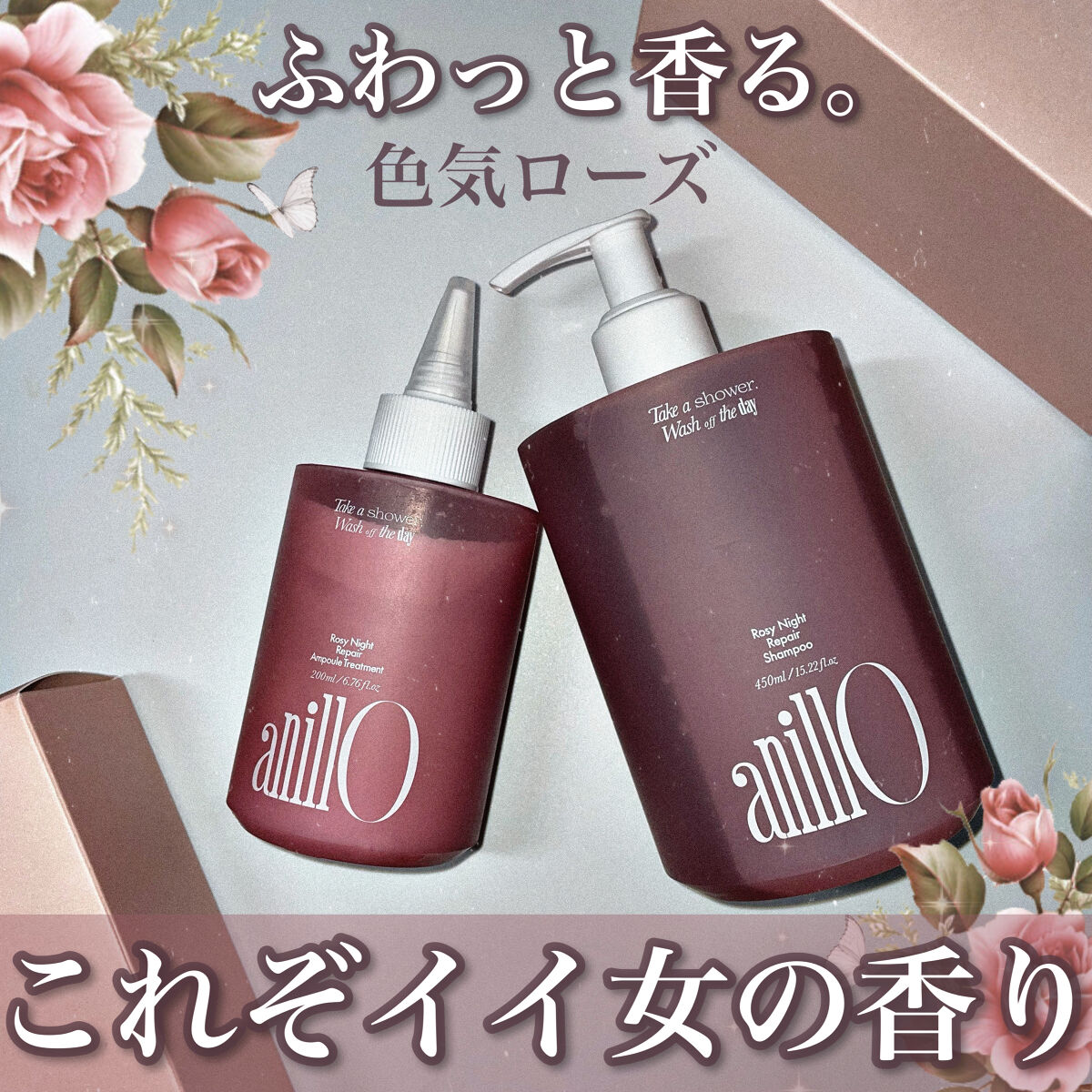 ローズムスクの香りで癒される、おしゃれなパケのヘアケア🌷♡ANILLO・ロージーナイトリペアシャンプー450ml・アンプルトリートメント200ml・ロージーナイトヘアエッセンス50mLポイント💡・ロージーナイトリペアシャンプー✔️ローズ水を4...