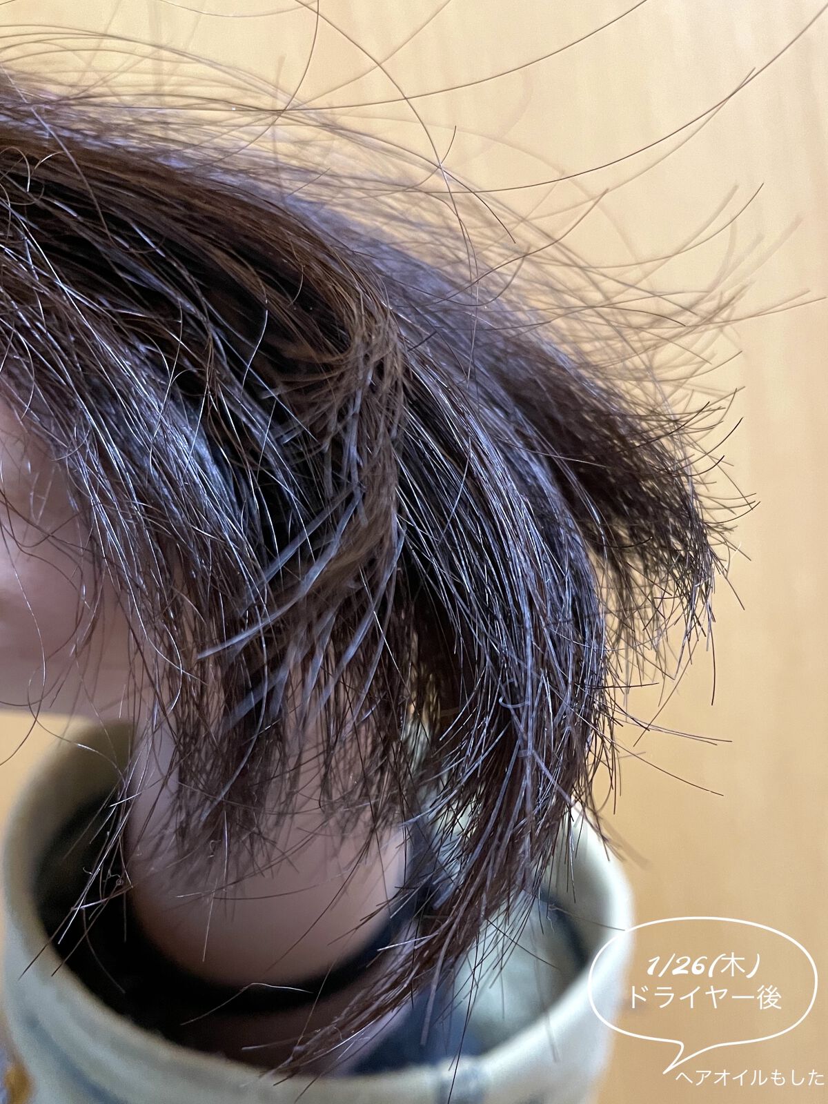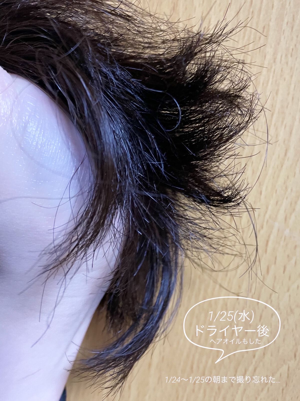 ヘアマスク直後だからとても指通りが良い。 インバスケアのおかげでパサつきが抑えられている気が増してきた。 寝起きなのに、絡まりがあまりない。 ヘアマスクとインバスケアの効果が出てきたのかな? ドライヤー後の髪は、いつもより少しだけボリュームダウンしてるような…?(乾燥で膨らむ)