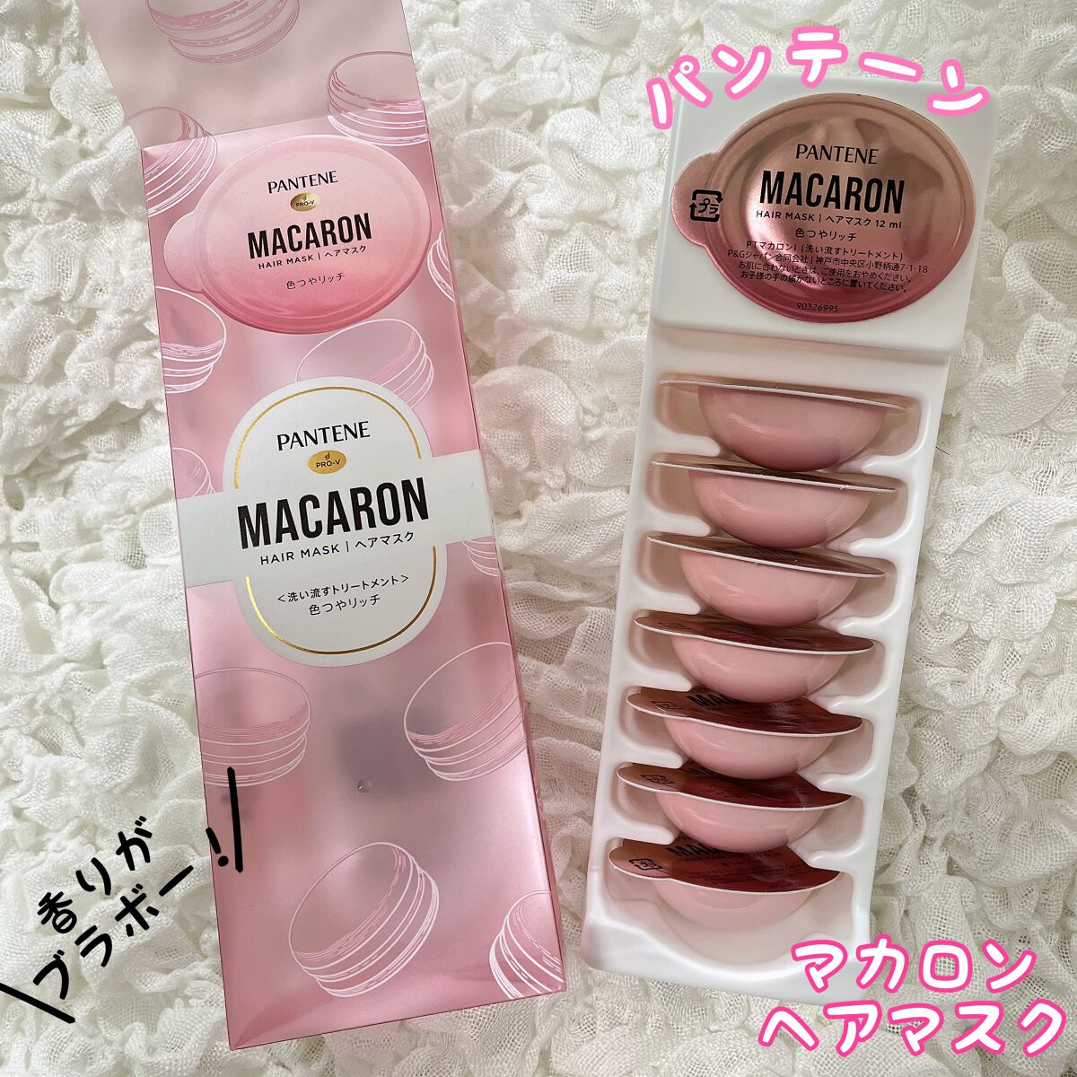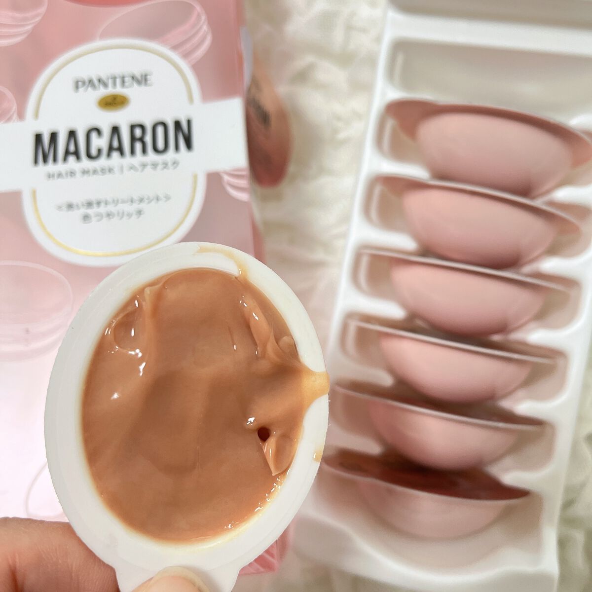 - 「パンテーン マカロン ヘアマスク」は、1粒に1回分の洗い流すトリートメントがたっぷり詰まった、使い切りタイプのヘアマスクです。 マカロンのようなカプセル型のユニークなパッケージの可愛さのみならず、個包装の使い切りタイプによる3つの特長で、たった1粒で、ずっと続く、うるおいつめく髪/色つや髪へ導きます。 1.1粒にたっぷりの洗い流すトリートメントをギュッと濃縮。すぐに感じる、もっとまとまる髪へ! 「パンテーン マカロン ヘアマスク」は、1粒にたっぷり12mLの洗い流すトリートメントが入っています。様々な髪の長さ、量の方でも髪の内側までしっかりと塗布することができ、効果を発揮します。 たっぷりの量を使用することで、髪のまとまり感がアップ。 2.いつでも開けたて、フレッシュな洗い流すトリートメント カプセル型のパッケージに入った個包装の1回使い切りなので、いつでも開けたてのフレッシュさ。 毎回、使う直前に手のひらで“メルティうるおいパール*”を混ぜ合わせて、1粒で、長時間続くうるおいつやめく髪へ。(うるつやリッチのみ) *黄色いカプセルのこと 3.個包装だから持ち運びOK。いつでもどこでも、うるつや髪・色つや髪に 日々のケアはもちろん、1粒ずつ持ち運ぶことが出来るので、ジムやサウナ、お泊り会、旅行・出張など、様々なシーンで使うことが出来ます。いつでも・どこでもうるつや髪/色つや髪に。