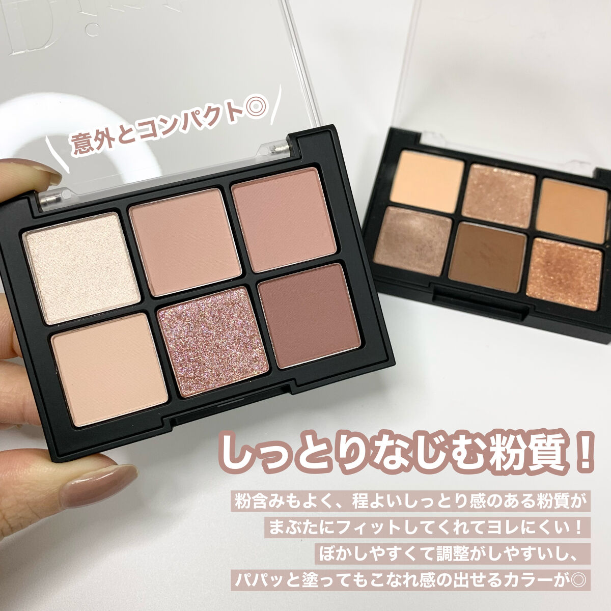 めっちゃくちゃ進化してるーーー😳😳😳 ブラシでも指でも取った瞬間の柔らかさが桁違いに良くなってる!!! ふわっとブレンドしやすくてボカしやすい!!! 05トフィーナッツラテはデイリー使いしやすい ナチュラル発色でかなり自然な仕上がり🥜 今っぽい色味で盛らずに陰影で盛る感じです💗 明度にしっかり差があって陰影をつけやすい◎ 06バニラティーラテはほろ苦ピンクメイクに🎀 05と比較するとかなり強い発色で スモーキーメイクに合いそうなパレット! パレット左から2番目のホワイトラメが ほんとに可愛くて透けるように光る感じ💎