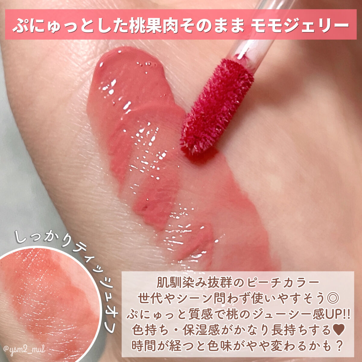 - <01 モモジェリー> Water、Diphenyl Dimethicone、Diisostearyl Malate、Bis-Diglyceryl Polyacyladipate-2、Hydrogenated Polyisobutene、Bis-Behenyl/Isostearyl/Phytosteryl Dimer Dilinoleyl Dimer Dilinoleate、Cetyl PEG/PPG-10/1 Dimethicone、Diglycerin、Hydrogenated Polydecene、Dipropylene Glycol、Polysorbate 60、Sorbitan Isostearate、Hydroxyethyl Acrylate/Sodium Acryloyldimethyl Taurate Copolymer、Pentylene Glycol、Squalane、Titanium Dioxide (CI 77891)、Ethylene/Propylene Copolymer、Ceteareth-20、Phenoxyethanol、Polyglycerin-3、Yellow 5 (CI 19140)、Red 33 (CI 17200)、Fragrance、Ethylhexylglycerin、Glycerin、Aluminum Hydroxide、Ammonium Polyacrylate、Yellow 6 (CI 15985)、Butylene Glycol、Blue 1 (CI 42090)、Tocopheryl Acetate、Prunus Persica (Peach) Fruit Extract、1,2-Hexanediol、Sodium Hyaluronate、Hydroxypropyltrimonium Hyaluronate、Sodium Acetylated Hyaluronate、Hydrolyzed Hyaluronic acid、Hyaluronic Acid、Sodium Hyaluronate Crosspolymer、Hydrolyzed Sodium Hyaluronate、Potassium Hyaluronate <02 ヘルシーサーモン> Water、Diphenyl Dimethicone、Diisostearyl Malate、Bis-Diglyceryl Polyacyladipate-2、Hydrogenated Polyisobutene、Bis-Behenyl/Isostearyl/Phytosteryl Dimer Dilinoleyl Dimer Dilinoleate、Cetyl PEG/PPG-10/1 Dimethicone、Diglycerin、Hydrogenated Polydecene、Dipropylene Glycol、Polysorbate 60、Sorbitan Isostearate、Hydroxyethyl Acrylate/Sodium Acryloyldimethyl Taurate Copolymer、Pentylene Glycol、Squalane、Ethylene/Propylene Copolymer、Ceteareth-20、Phenoxyethanol、Titanium Dioxide (CI 77891)、Polyglycerin-3、Yellow 6 (CI 15985)、Fragrance、Ethylhexylglycerin、Red 33 (CI 17200)、Glycerin、Red 28 (CI 45410)、Aluminum Hydroxide、Ammonium Polyacrylate、Yellow 5 (CI 19140)、Butylene Glycol、Tocopheryl Acetate、Blue 1 (CI 42090)、Prunus Persica (Peach) Fruit Extract、1,2-Hexanediol、Sodium Hyaluronate、Hydroxypropyltrimonium Hyaluronate、Sodium Acetylated Hyaluronate、Hydrolyzed Hyaluronic acid、Hyaluronic Acid、Sodium Hyaluronate Crosspolymer、Hydrolyzed Sodium Hyaluronate、Potassium Hyaluronate <03 ヌーディーピンク> Water、Diphenyl Dimethicone、Diisostearyl Malate、Bis-Diglyceryl Polyacyladipate-2、Hydrogenated Polyisobutene、Bis-Behenyl/Isostearyl/Phytosteryl Dimer Dilinoleyl Dimer Dilinoleate、Cetyl PEG/PPG-10/1 Dimethicone、Diglycerin、Hydrogenated Polydecene、Dipropylene Glycol、Polysorbate 60、Sorbitan Isostearate、Hydroxyethyl Acrylate/Sodium Acryloyldimethyl Taurate Copolymer、Pentylene Glycol、Squalane、Ethylene/Propylene Copolymer、Ceteareth-20、Titanium Dioxide (CI 77891)、Phenoxyethanol、Polyglycerin-3、Red 33 (CI 17200)、Yellow 5 (CI 19140)、Fragrance、Ethylhexylglycerin、Glycerin、Aluminum Hydroxide、Ammonium Polyacrylate、Butylene Glycol、Blue 1 (CI 42090)、Tocopheryl Acetate、Prunus Persica (Peach) Fruit Extract、1,2-Hexanediol、Sodium Hyaluronate、Hydroxypropyltrimonium Hyaluronate、Sodium Acetylated Hyaluronate、Hydrolyzed Hyaluronic acid、Hyaluronic Acid、Sodium Hyaluronate Crosspolymer、Hydrolyzed Sodium Hyaluronate、Potassium Hyaluronate <04 ローズミルク> Water、Diphenyl Dimethicone、Diisostearyl Malate、Bis-Diglyceryl Polyacyladipate-2、Hydrogenated Polyisobutene、Bis-Behenyl/Isostearyl/Phytosteryl Dimer Dilinoleyl Dimer Dilinoleate、Cetyl PEG/PPG-10/1 Dimethicone、Diglycerin、Hydrogenated Polydecene、Dipropylene Glycol、Polysorbate 60、Sorbitan Isostearate、Hydroxyethyl Acrylate/Sodium Acryloyldimethyl Taurate Copolymer、Pentylene Glycol、Squalane、Ethylene/Propylene Copolymer、Ceteareth-20、Titanium Dioxide (CI 77891)、Phenoxyethanol、Polyglycerin-3、Red 28 (CI 45410)、Yellow 6 (CI 15985)、Fragrance、Ethylhexylglycerin、Red 33 (CI 17200)、Glycerin、Aluminum Hydroxide、Ammonium Polyacrylate、Butylene Glycol、Blue 1 (CI 42090)、Tocopheryl Acetate、Prunus Persica (Peach) Fruit Extract、1,2-Hexanediol、Sodium Hyaluronate、Hydroxypropyltrimonium Hyaluronate、Sodium Acetylated Hyaluronate、Hydrolyzed Hyaluronic acid、Hyaluronic Acid、Sodium Hyaluronate Crosspolymer、Hydrolyzed Sodium Hyaluronate、Potassium Hyaluronate <05 ベージュフィグ> Water、Diphenyl Dimethicone、Diisostearyl Malate、Bis-Diglyceryl Polyacyladipate-2、Hydrogenated Polyisobutene、Bis-Behenyl/Isostearyl/Phytosteryl Dimer Dilinoleyl Dimer Dilinoleate、Cetyl PEG/PPG-10/1 Dimethicone、Diglycerin、Hydrogenated Polydecene、Dipropylene Glycol、Polysorbate 60、Sorbitan Isostearate、Hydroxyethyl Acrylate/Sodium Acryloyldimethyl Taurate Copolymer、Pentylene Glycol、Squalane、Titanium Dioxide (CI 77891)、Ethylene/Propylene Copolymer、Ceteareth-20、Phenoxyethanol、Polyglycerin-3、Yellow 5 (CI 19140)、Red 33 (CI 17200)、Fragrance、Ethylhexylglycerin、Yellow 6 (CI 15985)、Glycerin、Aluminum Hydroxide、Ammonium Polyacrylate、Butylene Glycol、Blue 1 (CI 42090)、Tocopheryl Acetate、Prunus Persica (Peach) Fruit Extract、1,2-Hexanediol、Sodium Hyaluronate、Hydroxypropyltrimonium Hyaluronate、Sodium Acetylated Hyaluronate、Hydrolyzed Hyaluronic acid、Hyaluronic Acid、Sodium Hyaluronate Crosspolymer、Hydrolyzed Sodium Hyaluronate、Potassium Hyaluronate <06 ソウルガール> Water、Diphenyl Dimethicone、Diisostearyl Malate、Bis-Diglyceryl Polyacyladipate-2、Hydrogenated Polyisobutene、Bis-Behenyl/Isostearyl/Phytosteryl Dimer Dilinoleyl Dimer Dilinoleate、Cetyl PEG/PPG-10/1 Dimethicone、Diglycerin、Hydrogenated Polydecene、Dipropylene Glycol、Polysorbate 60、Sorbitan Isostearate、Hydroxyethyl Acrylate/Sodium Acryloyldimethyl Taurate Copolymer、Pentylene Glycol、Squalane、Ethylene/Propylene Copolymer、Ceteareth-20、Titanium Dioxide (CI 77891)、Phenoxyethanol、Polyglycerin-3、Red 33 (CI 17200)、Yellow 6 (CI 15985)、Fragrance、Ethylhexylglycerin、Yellow 5 (CI 19140)、Glycerin、Aluminum Hydroxide、Ammonium Polyacrylate、Blue 1 (CI 42090)、Butylene Glycol、Tocopheryl Acetate