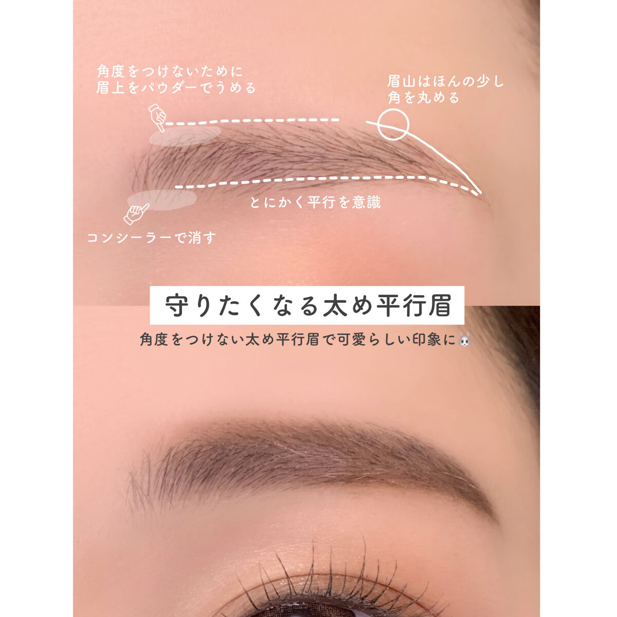 最初にアイブロウパウダーを眉尻以外に大体の形を作る様にのせて、薄いところにのみペンシルを使って濃さを足しています。 眉マスカラは眉の中央から眉尻にかけてジグザグさせながら塗り、眉頭は上方向にとかすように塗ると自然な眉になります👏 使っている眉マスカラと色味が少し合わなくても最後に軽くまたパウダーをのせることで微調整が出来ます🌸
