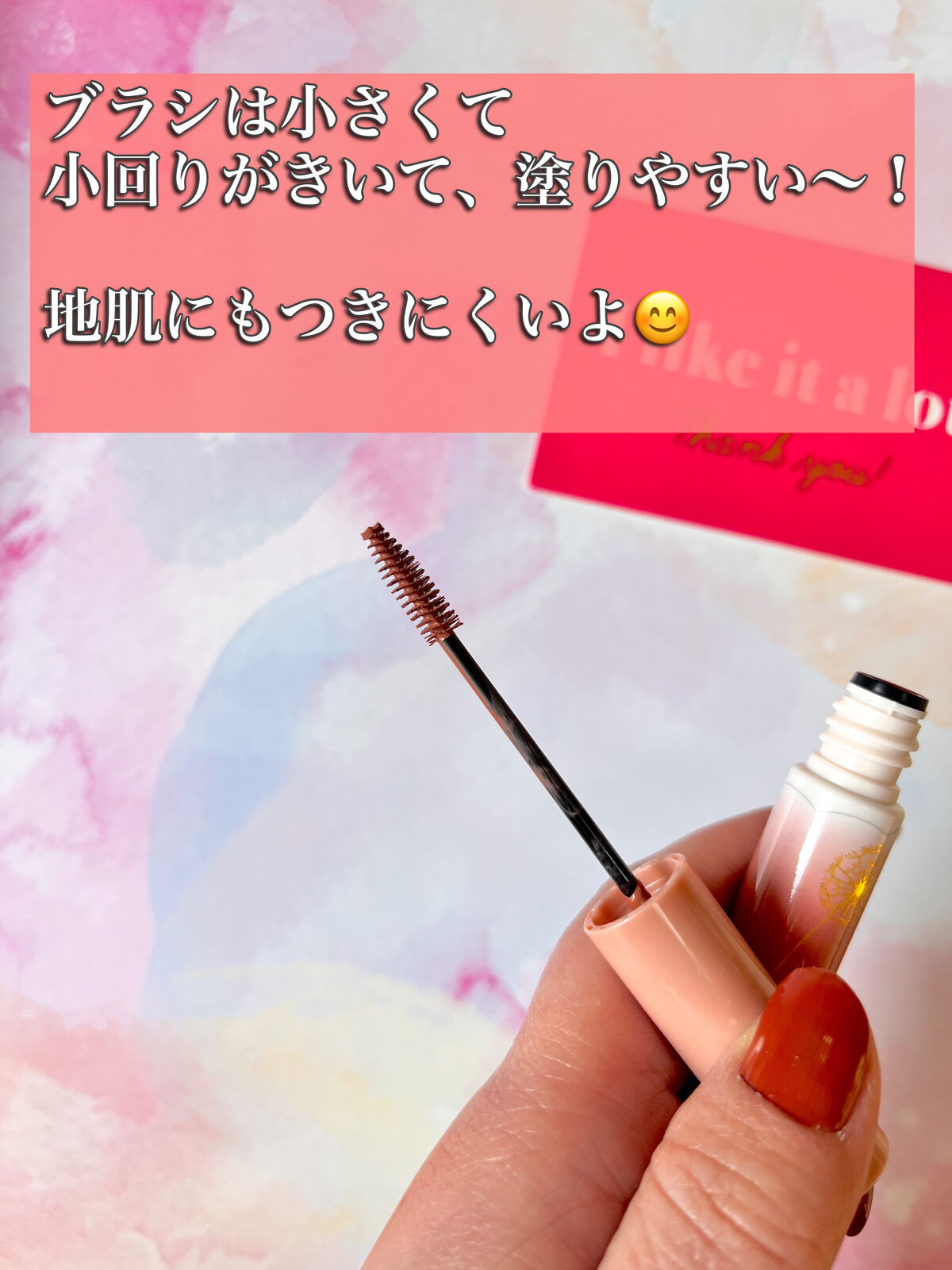- ミニブラシでとにかく塗りやすい!! ふんわり仕上がる眉マスカラ 小回りの利くミニブラシがとっても塗りやすい眉マスカラ。 毛を1本1本逃さず、ナチュラルに染まります。 パリパリ感もなく、ふんわりとした自眉感のある仕上がりに! 地肌につきにくいのもうれしいポイント♡