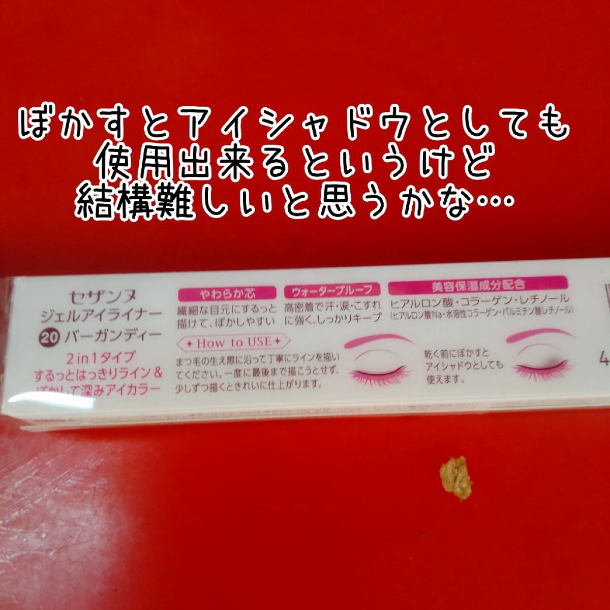 - なめらか高密着2in1ジェルアイライナー。 ぼかして使うとアイカラーとしても使える2in1タイプ。 オイルリッチ処方でなめらかな描き心地。 高密着で、水・汗・涙・こすれに強いウォータープルーフ。 保湿成分(ヒアルロン酸・コラーゲン・レチノール(ヒアルロン酸Na・水溶性コラーゲン・パルミチン酸レチノール))配合。