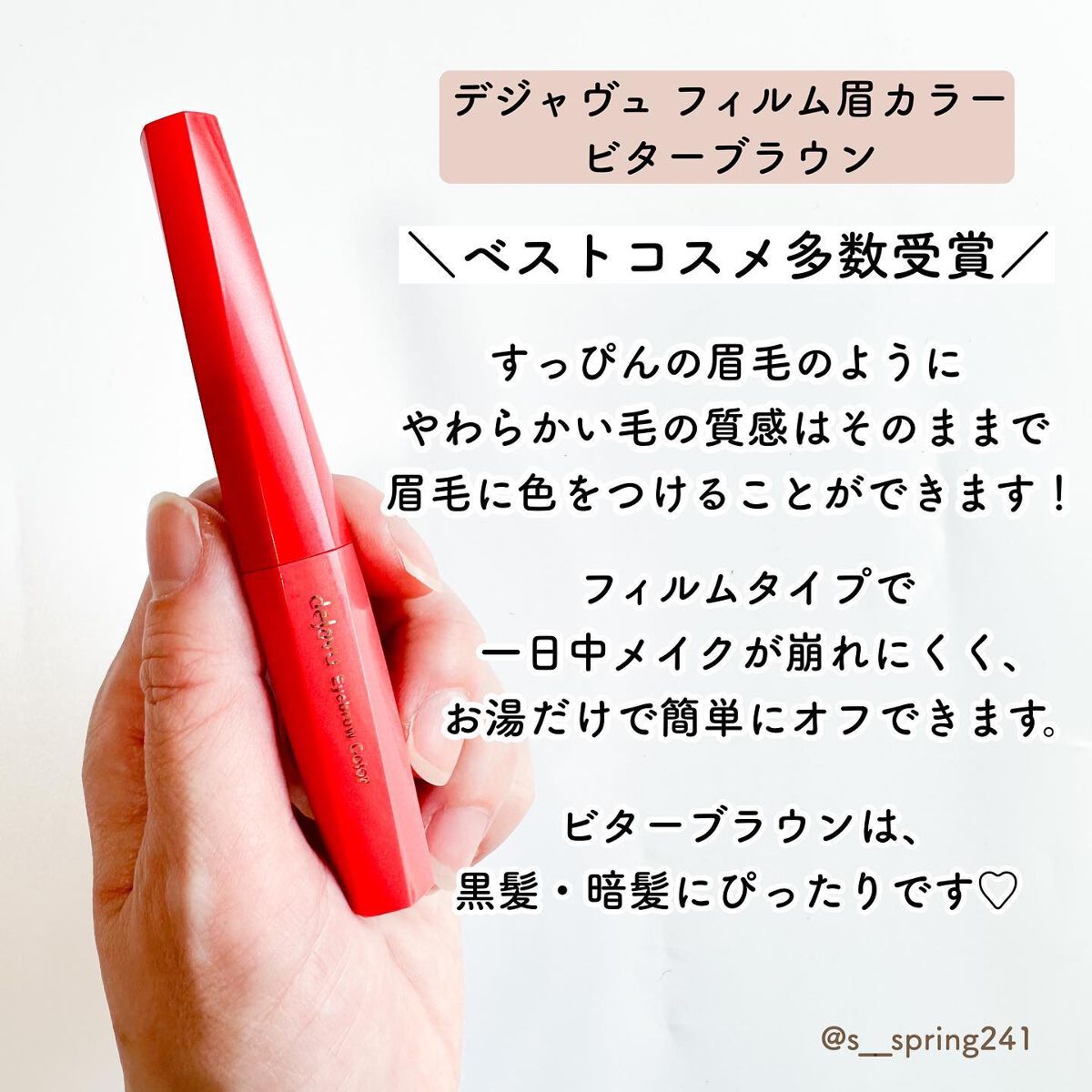 - \\25年3月定番新色モカグレージュ発売// 「フィルム眉カラー」なら眉の印象を自然にやわらげ、ふんわり質感の垢抜け眉に! 1.塗りやすい極小ブラシ ・ 先端直径3mmで、地肌に液がつきにくく根元から色づける ・余分な液がつかない設計で、ティッシュオフ不要 2.眉専用フィルム液 ・眉毛1本1本にキレイに色付き、自眉の黒さをやわらげる ・タバになったり、パリッと固まったりせず、まるで自眉のような仕上がり ・皮脂・汗・こすれに強いのにお湯で簡単オフ (※2025年9月以降、商品パッケージをリニューアル。) デジャヴュ アイブロウカラー