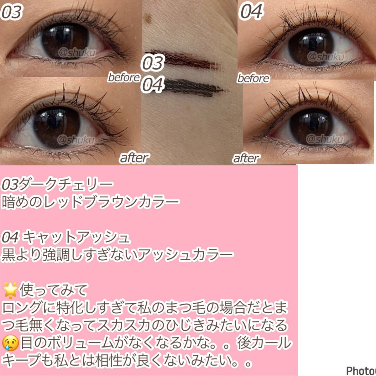 ブラシは少し太めでカーブしてるタイプ 塗りやすく長さがでる! 少しだけボリュームもアップ! 帰ってから少しだけ滲んでいました キープ力は6時間後でこんな感じ! 真正面見るとまつ毛が少ししか見えない位置に ブラシは細くてストレートタイプ。 繊細なまつ毛を演出 これが一番自然に伸びている感じ! ボリューム感は一番少ない! 少量で少しずつ伸びる感じだから、何回もマスカラ液つけてはまつ毛につけての 工程がいつもより長いからちょっとそこが気になるかな けど、ブラシが小さいから端の端までできる ブラシは太くて短めのタイプ。 少し塗りにくいかも あと、この中では唯一すこしダマもできる コームは必須マスカラ! ボリュームと程よいロング感! 仕上がりの好みはこれが一番好き!! キープ力は一緒くらい。