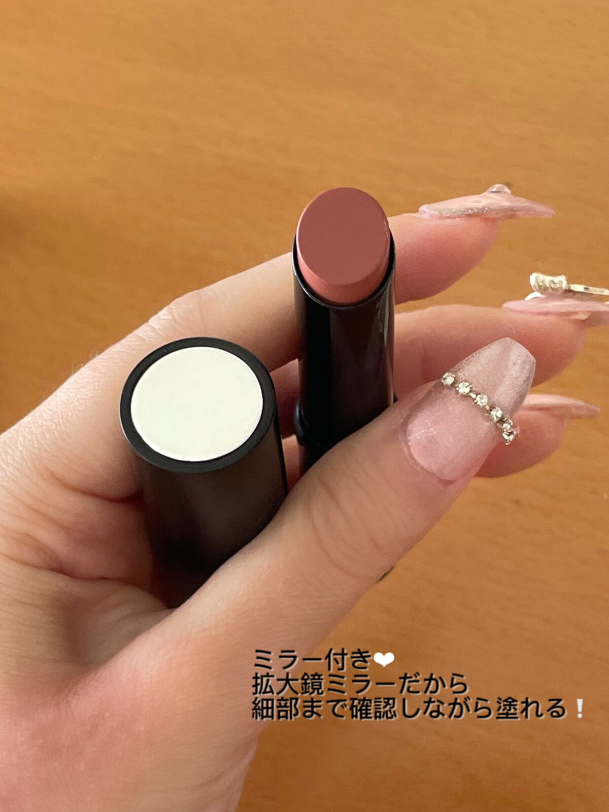 実際に塗ると、ミルクティーのようなピンクに発色しました😳❣ 私のように唇の色が濃い人は、ブラウンがかかった色に発色するのではないかなと思います❕ 保湿はあります👍🏻 ̖́-縦じわが消えます~❕ 艶のあるうるうるリップが仕上がり、唇がぷっくりして見えます❕