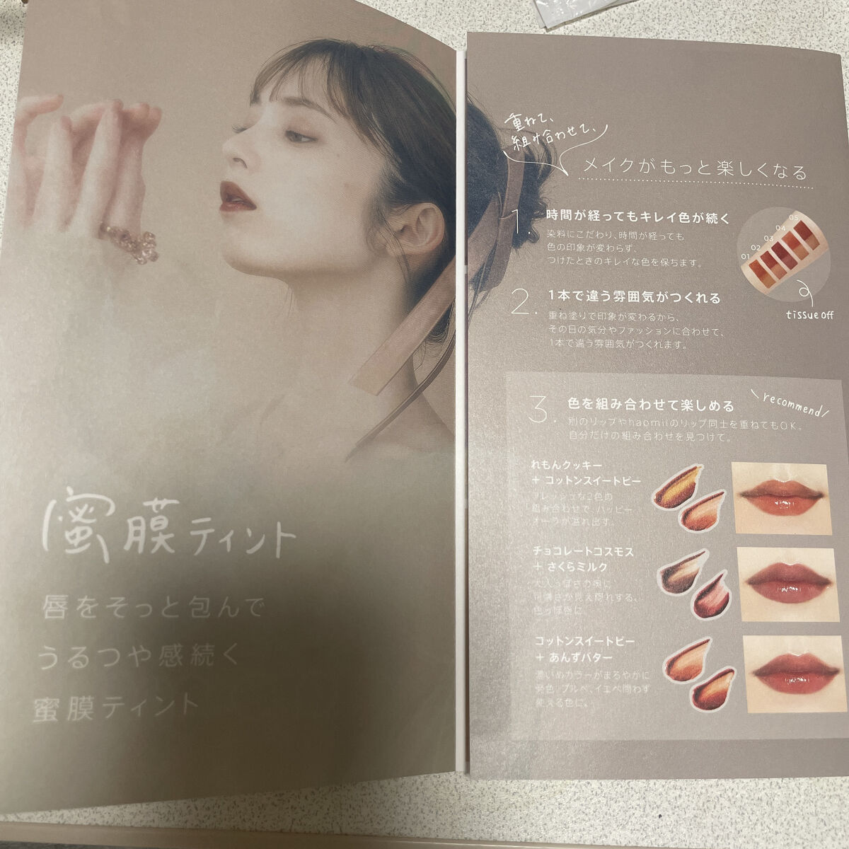 - <01 れもんクッキー> ジフェニルジメチコン、水、リンゴ酸ジイソステアリル、ビスジグリセリルポリアシルアジペート-2、オクチルドデカノール、水添ポリイソブテン、ダイマージリノール酸ダイマージリノレイルビス(ベヘニル/イソステアリル/フィトステリル)、ジグリセリン、DPG、セチルPEG/PPG-10/1ジメチコン、イソステアリン酸ソルビタン、ポリソルベート60、スクワラン、アーモンド油、オリーブ果実油、アルガニアスピノサ核油、カニナバラ果実エキス、トリ(カプリル酸/カプリン酸)グリセリル、グリセリン、ステビオシド、(アクリル酸ヒドロキシエチル/アクリロイルジメチルタウリンNa)コポリマー、ポリグリセリン-3、ペンチレングリコール、エチルヘキシルグリセリン、セテアレス-20、テトラ(ジ-t-ブチルヒドロキシヒドロケイヒ酸)ペンタエリスリチル、フェノキシエタノール、香料、酸化チタン、酸化鉄、赤227、黄4、黄5 <02 あんずバター> ジフェニルジメチコン、水、リンゴ酸ジイソステアリル、ビスジグリセリルポリアシルアジペート-2、オクチルドデカノール、水添ポリイソブテン、ダイマージリノール酸ダイマージリノレイルビス(ベヘニル/イソステアリル/フィトステリル)、ジグリセリン、DPG、セチルPEG/PPG-10/1ジメチコン、イソステアリン酸ソルビタン、ポリソルベート60、スクワラン、アーモンド油、オリーブ果実油、アルガニアスピノサ核油、カニナバラ果実エキス、トリ(カプリル酸/カプリン酸)グリセリル、グリセリン、ステビオシド、(アクリル酸ヒドロキシエチル/アクリロイルジメチルタウリンNa)コポリマー、ポリグリセリン-3、ペンチレングリコール、エチルヘキシルグリセリン、セテアレス-20、テトラ(ジ-t-ブチルヒドロキシヒドロケイヒ酸)ペンタエリスリチル、フェノキシエタノール、香料、酸化チタン、酸化鉄、赤227、黄4、黄5 <03 さくらミルク > ジフェニルジメチコン、水、リンゴ酸ジイソステアリル、ビスジグリセリルポリアシルアジペート-2、オクチルドデカノール、水添ポリイソブテン、ダイマージリノール酸ダイマージリノレイルビス(ベヘニル/イソステアリル/フィトステリル)、ジグリセリン、DPG、セチルPEG/PPG-10/1ジメチコン、イソステアリン酸ソルビタン、ポリソルベート60、スクワラン、アーモンド油、オリーブ果実油、アルガニアスピノサ核油、カニナバラ果実エキス、トリ(カプリル酸/カプリン酸)グリセリル、グリセリン、ステビオシド、(アクリル酸ヒドロキシエチル/アクリロイルジメチルタウリンNa)コポリマー、ポリグリセリン-3、ペンチレングリコール、エチルヘキシルグリセリン、セテアレス-20、テトラ(ジ-t-ブチルヒドロキシヒドロケイヒ酸)ペンタエリスリチル、フェノキシエタノール、香料、酸化チタン、赤227、黄4、青1 <04 コットンスイートピー > ジフェニルジメチコン、水、リンゴ酸ジイソステアリル、ビスジグリセリルポリアシルアジペート-2、オクチルドデカノール、水添ポリイソブテン、ダイマージリノール酸ダイマージリノレイルビス(ベヘニル/イソステアリル/フィトステリル)、ジグリセリン、DPG、セチルPEG/PPG-10/1ジメチコン、イソステアリン酸ソルビタン、ポリソルベート60、スクワラン、アーモンド油、オリーブ果実油、アルガニアスピノサ核油、カニナバラ果実エキス、トリ(カプリル酸/カプリン酸)グリセリル、グリセリン、ステビオシド、(アクリル酸ヒドロキシエチル/アクリロイルジメチルタウリンNa)コポリマー、ポリグリセリン-3、ペンチレングリコール、エチルヘキシルグリセリン、セテアレス-20、テトラ(ジ-t-ブチルヒドロキシヒドロケイヒ酸)ペンタエリスリチル、フェノキシエタノール、香料、酸化チタン、酸化鉄、赤104(1)、黄5、青1 <05 チョコレートコスモス> ジフェニルジメチコン、水、リンゴ酸ジイソステアリル、ビスジグリセリルポリアシルアジペート-2、オクチルドデカノール、水添ポリイソブテン、ダイマージリノール酸ダイマージリノレイルビス(ベヘニル/イソステアリル/フィトステリル)、ジグリセリン、DPG、セチルPEG/PPG-10/1ジメチコン、イソステアリン酸ソルビタン、ポリソルベート60、スクワラン、アーモンド油、オリーブ果実油、アルガニアスピノサ核油、カニナバラ果実エキス、トリ(カプリル酸/カプリン酸)グリセリル、グリセリン、ステビオシド、(アクリル酸ヒドロキシエチル/アクリロイルジメチルタウリンNa)コポリマー、ポリグリセリン-3、ペンチレングリコール、エチルヘキシルグリセリン、セテアレス-20、テトラ(ジ-t-ブチルヒドロキシヒドロケイヒ酸)ペンタエリスリチル、フェノキシエタノール、香料、酸化チタン、酸化鉄、赤227、黄4、黄5、青1 <06 ももゼリー> ジフェニルジメチコン、水、リンゴ酸ジイソステアリル、ビスジグリセリルポリアシルアジペート-2、オクチルドデカノール、水添ポリイソブテン、ダイマージリノール酸ダイマージリノレイルビス(ベヘニル/イソステアリル/フィトステリル)、ジグリセリン