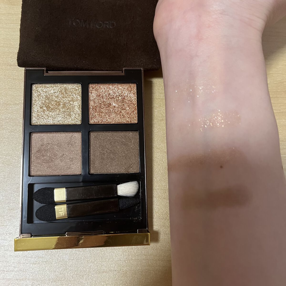 TOMFORDBEAUTYアイカラークォード01ゴールデンミンク左上のゴールドを涙袋に💛左下のベージュをベースに🧸右上のキラキラを二重幅に✨右下のブラウンをライナーに🤎ྀིだいたいトム様パレットは、右下の濃いカラーがライナーになります꒰՞ɞ̴...