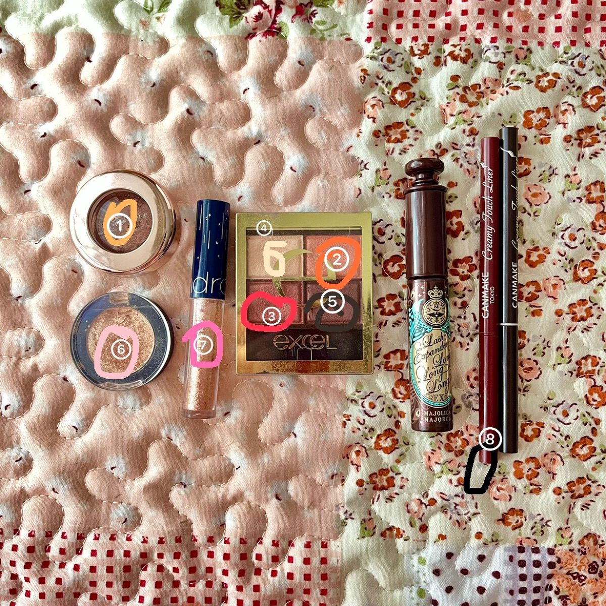 照明が当たった時のラメ感が盛れる😍 ブラウン系をメインに使ったので、ラメなしならオフィスメイクでも可ですよ〜😋 デコルテのアイグロウジェムがエクセルシャドウのラメ感をさらに引き立ててくれます😌 境目はぼかす!!これにつきる! 大きめのブラシで全部載せるとふわっと発色してあんまりけばくならない! 切開ラインを5枚目の写真のように引くと、赤い部分が拡張され、自然とデカ目効果に ラメを目尻の延長線上に書くと涙みたいでかわいい…😍 リップはベージュ系だとナチュラル、レッド系になるとゴージャスになります😍