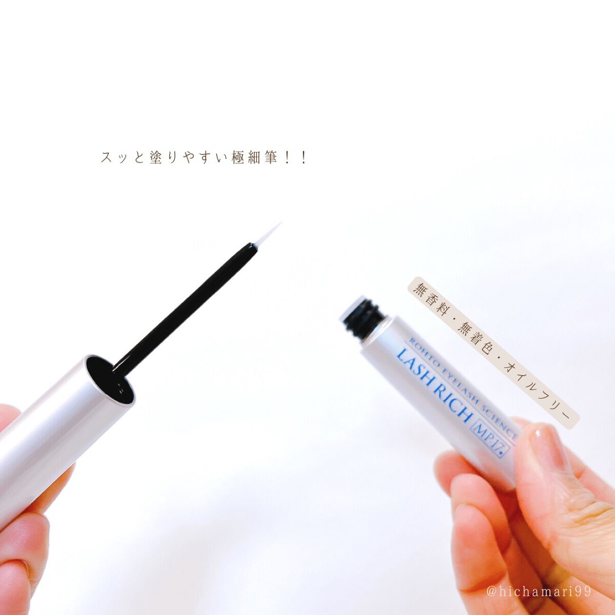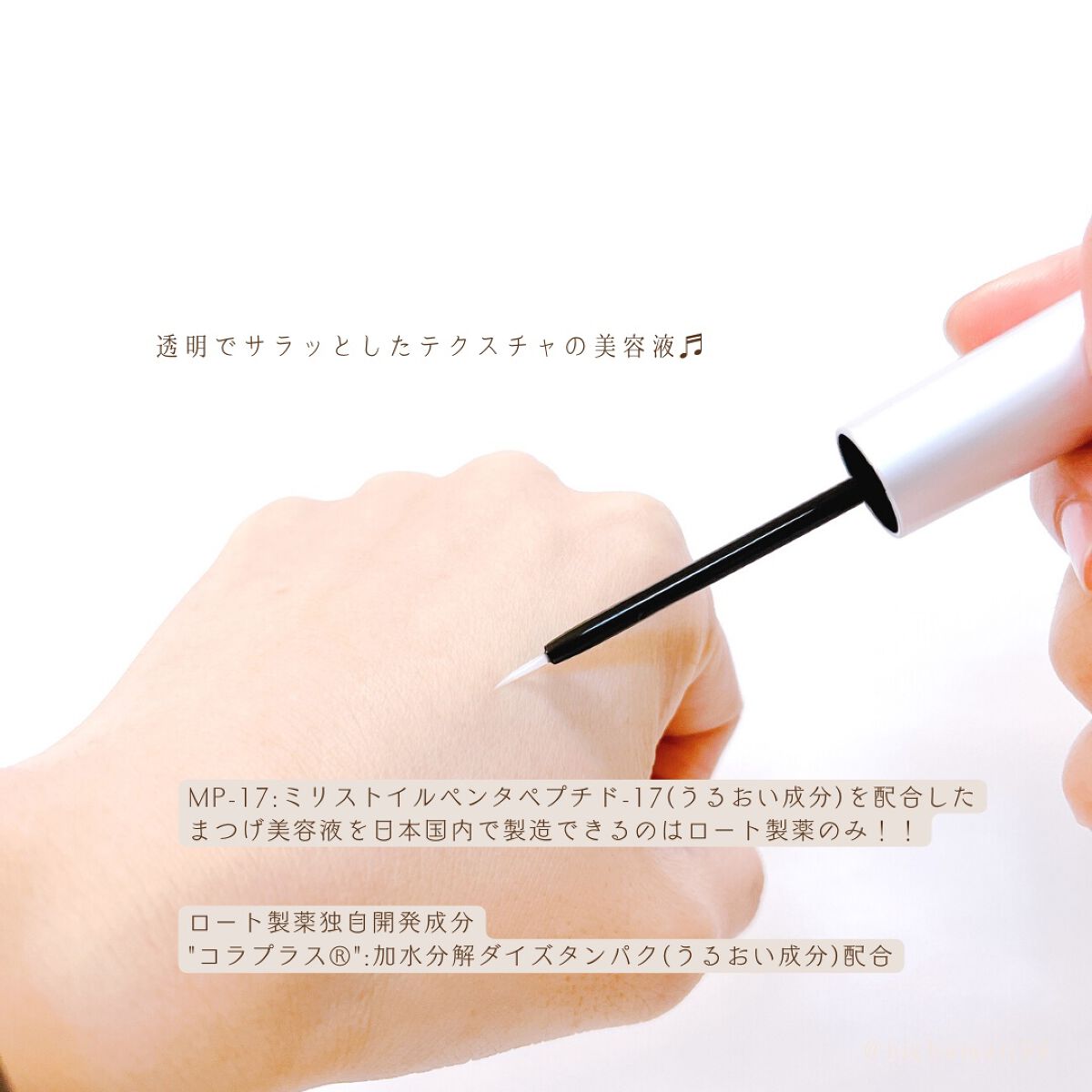 なめらかな使用感の細筆になっていて、まつ毛に塗りやすいです。みずみずしいテクスチャーの美容液で、すっと塗ることが出来ます。 ”ロート製薬が本気で作ったまつ毛美容液” 目の周りや毛髪、皮膚に至るまで多角的に研究を行ってきたロート製薬だからこそ出来た「MP-17(ミリストイルペンタペプチド-17)」配合の国内唯一のまつ毛美容液。