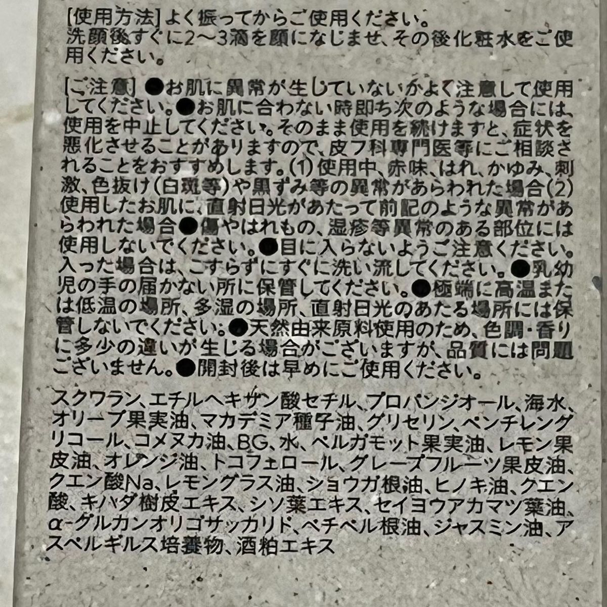 - <本体> スクワラン、エチルヘキサン酸セチル、プロパンジオール、海水、オリーブ果実油、マカデミア種子油、グリセリン、ペンチレングリコール、コメヌカ油、BG、水、ベルガモット果実油、レモン果皮油、オレンジ油、トコフェロール、グレープフルーツ果皮油、クエン酸Na、レモングラス油、ショウガ根油、ヒノキ油、クエン酸、キハダ樹皮エキス、シソ葉エキス、セイヨウアカマツ葉油、α-グルカンオリゴサッカリド、ベチベル根油、ジャスミン油、アスペルギルス培養物、酒粕エキス