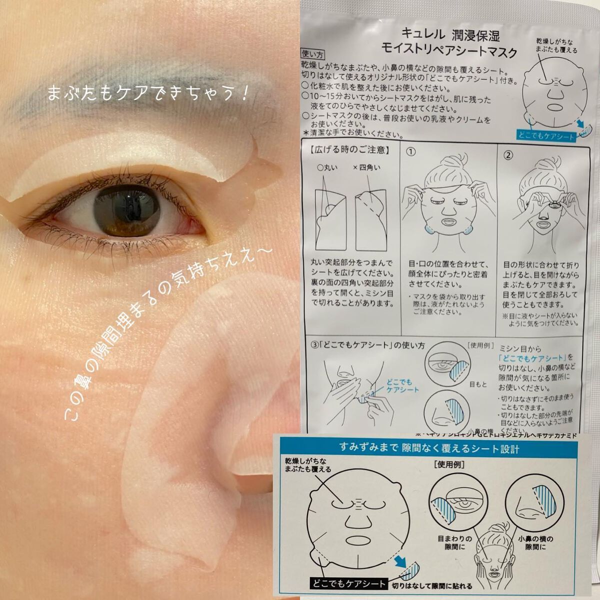 肌あたりのやさしいやわらかシートでまぶたも小鼻もスキなくフィット!しっかり肌を包み込んでくれるようなシートマスクだよ😊 切りはなして使えるどこでもケアシートがついてるの!これまた便利で目まわりや口もと、小鼻わきなど隙間が気になるところに使えるの! パックのあとはお肌うるるん♩しっとりするのにベタつきを感じないよ。