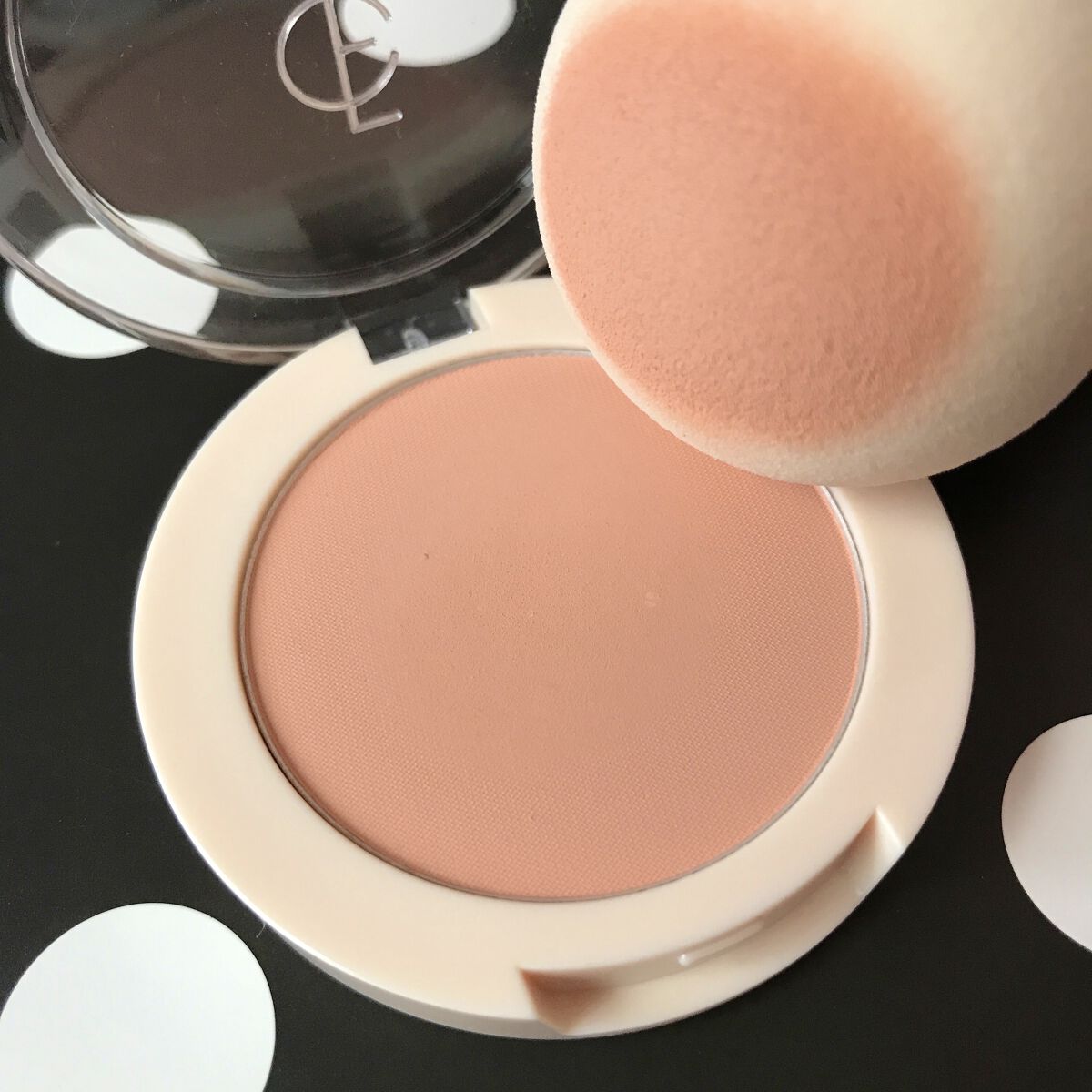 ふんわりコーラルカラーがかわいいです🌟 塗ると見た目の色より明るく発色する印象です。 付属のキノコ型のパフでポンポンしてもいいし、ブラシでくるくる塗ってもふんわり付いてかわいいです。 粉質はサラサラで毛穴をぼかしてくれます!
