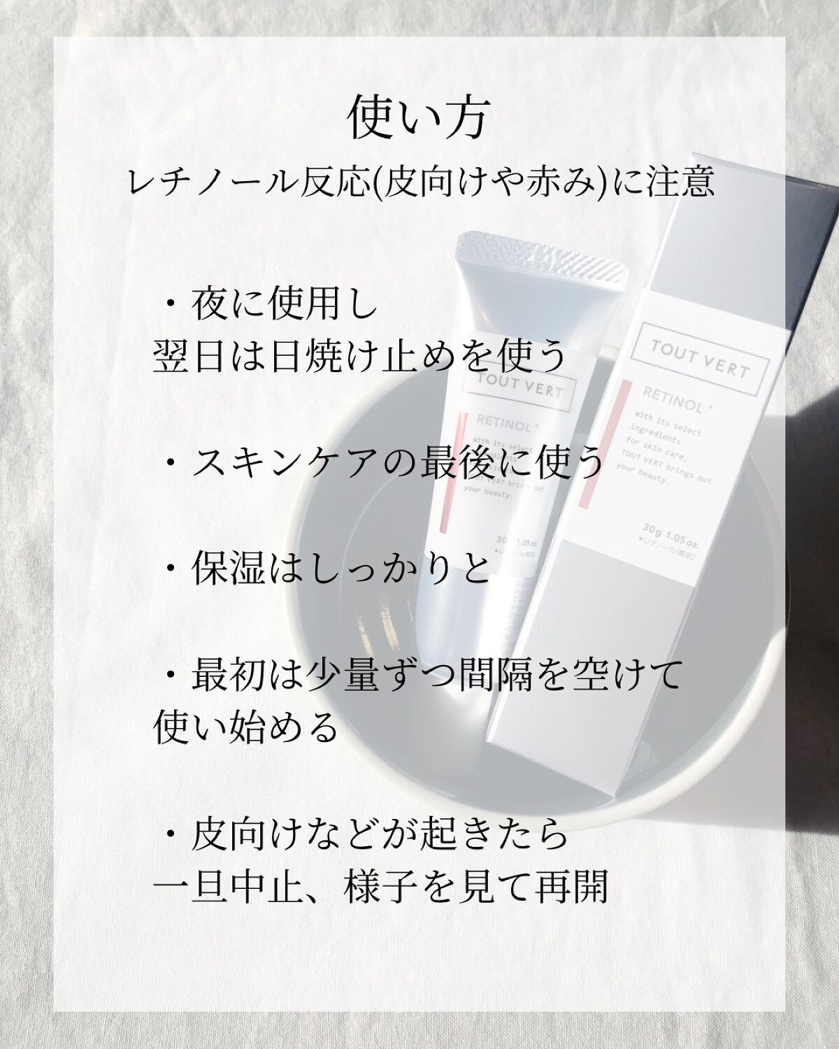 TOUTVERTトゥヴェール 純粋レチノールクリーム レチノショット0.1シワ、ハリ、クマなど。。。エイジングケアだよね。。。お肌のことが気になるので、トゥヴェール公式、メガ割り、3,383円、ポイント使って2,983円で買えたぁ🥰ほんのりレ...