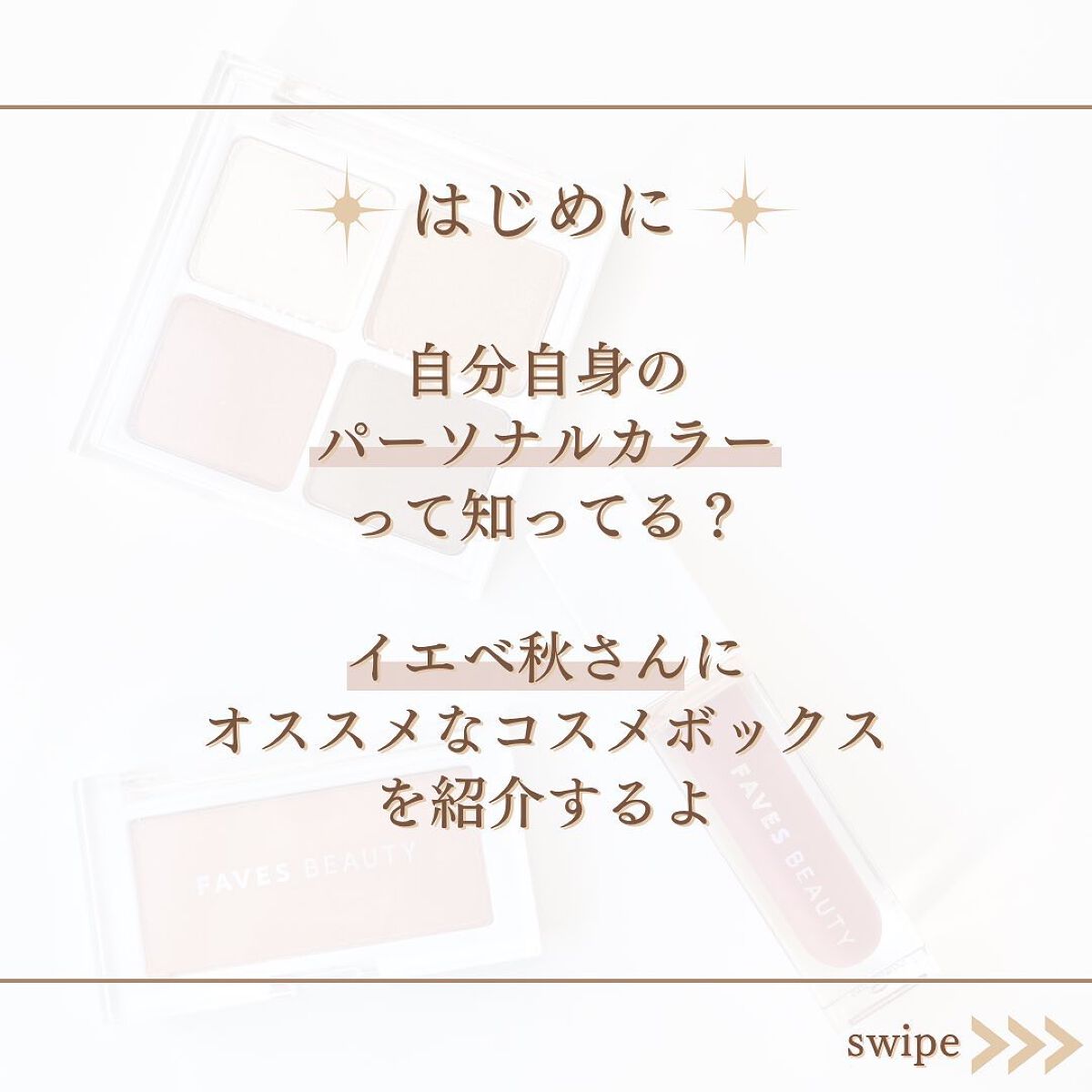 - FAVES BEAUTYは1人1人が持つ肌や瞳の色に合わせたパーソナルカラーで選ぶコスメブランドです。 イエローベースの春・秋、ブルーベースの夏・冬タイプからお選びいただけます。パーソナルカラーがわからない方は診断機能でチェック! アイシャドウ・チーク・リップのセットで、誰でも簡単に、こなれ感のあるバランスのとれた「垢抜けメイク」が完成! 毎日使いやすい色味やテクスチャーです。 無香料・パラベンフリー 【セット内容】 マイカラー アイパレット 3g×4色 マイカラー チーク 4g マイカラー オイルティントリップ 4.2g