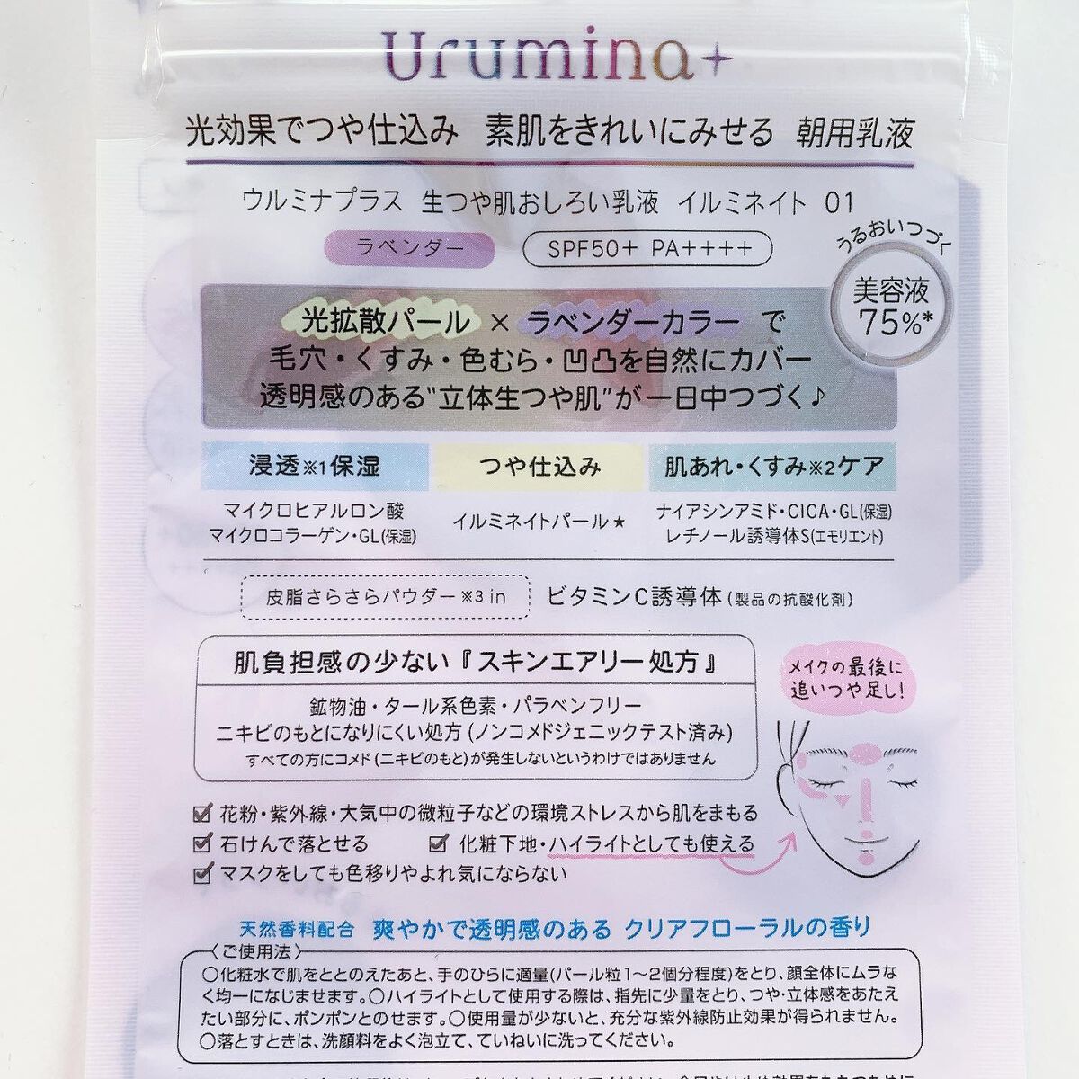 - 光拡散パール※1×ラベンダーカラーで、 透明感ある”立体生つや肌”が長時間つづく「生つや肌おしろい乳液 イルミネイト」です。 ♥Piont1: 光効果でつや&トーンアップ!素肌をきれいにみせるおしろい乳液 光拡散効果のある光拡散パール※1を配合し、トーンアップ効果のあるラベンダーカラーを採用することで、毛穴・くすみ・色むら・凹凸を自然にカバーし、透明感のある”立体生つや肌”を叶えます。さらに、皮脂テカリ防止成分の皮脂さらさらパウダー※2配合で、マスクをしてもメイクの色移りやよれにくい処方です。また、国内基準最高値のUVカット指数(SPF50+/PA++++)で紫外線からも肌を守ります。 ♥Piont2: 美容液成分75 %※3!肌あれケアしながらうるおいつづく 浸透※4保湿成分のマイクロヒアルロン酸※5やマイクロコラーゲン※6が、するりと肌に溶け込み、角層すみずみまでサッと浸透し、みずみずしいうるおいを与えます。また、CICA※7やナイアシンアミド※8・レチノール誘導体※9・ビタミンC誘導体(製品の抗酸化剤)※10配合により、肌あれケア※11・くすみ※12もケアします。 ♥Piont3:負担感の少ない「スキンエアリー処方」 無鉱物油、タール系色素フリー、パラベンフリー。肌への負担感が少なく、まるでつけていないかのような軽い使い心地です。また、ニキビのもとになりにくいノンコメドジェニックテスト済みです。※13 ♥Piont4:爽やかで透明感のあるクリアフローラルの香り(天然香料配合) ※1 マイカ・酸化チタン ※2 ポリメタクリル酸メチル ※3 粉体と紫外線吸収剤を除く ※4 角層まで ※5 加水分解ヒアルロン酸GL(保湿) ※6 加水分解コラーゲンGL(保湿) ※7ツボクサ葉エキスGL(保湿) ※8 ナイアシンアミドGL(保湿) ※9 パルミチン酸レチノールS(エモリエント) ※10テトラヘキシルデカン酸アスコビル ※11 予防のこと ※12 乾燥による、GLはグリセリン、Sはスクワランです。※13すべての方にコメド(ニキビのもと)が発生しないというわけではありません。