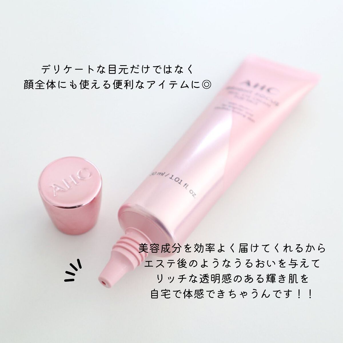独自の高浸透技術マイクロカプセルテクノロジー採用!✨ エステティックスキンケアのノウハウをもとに開発されたAHCブランド独自処方で、効率よく肌の奥(角質層内)まで浸透。 まるでエステを体験したようなリッチな透明感のある肌に🩷 アイクリームですが、目元だけじゃなく顔全体にも使える🙆♀️ しっとりうるおって、だけどベタつかないから良かった🙌 目元に使ってもベタベタしないから、メイク前に使いやすいと思いました!