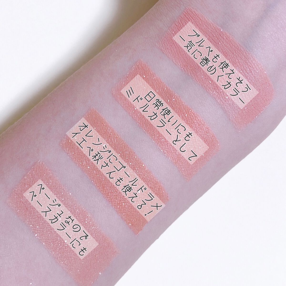 マットはかなりくすんだ色で、暗めのメイクに仕上がりがちに🤎 ツヤ感が大事だと言われるイエベ春でも、スモーキーメイク出来るんだ…!と思わせてくれたパレット。 愛して止まないミルクラテ、絶妙な柔らかベージュに透明感たっぷりのラメ✨️ 全色ラメ入りですが、真ん中2色のくすみと黄みが強く、どんよりした目元に…🥲 コーラルは大好きなんですが、このパレットは3滴白みを足したような色で、発色も弱くまぶたにも乗りづらく、かなり色白さんでないと使えない気がします…🥲 手持ちの中で1番黄み強いですが、1番完成度の高いです💕