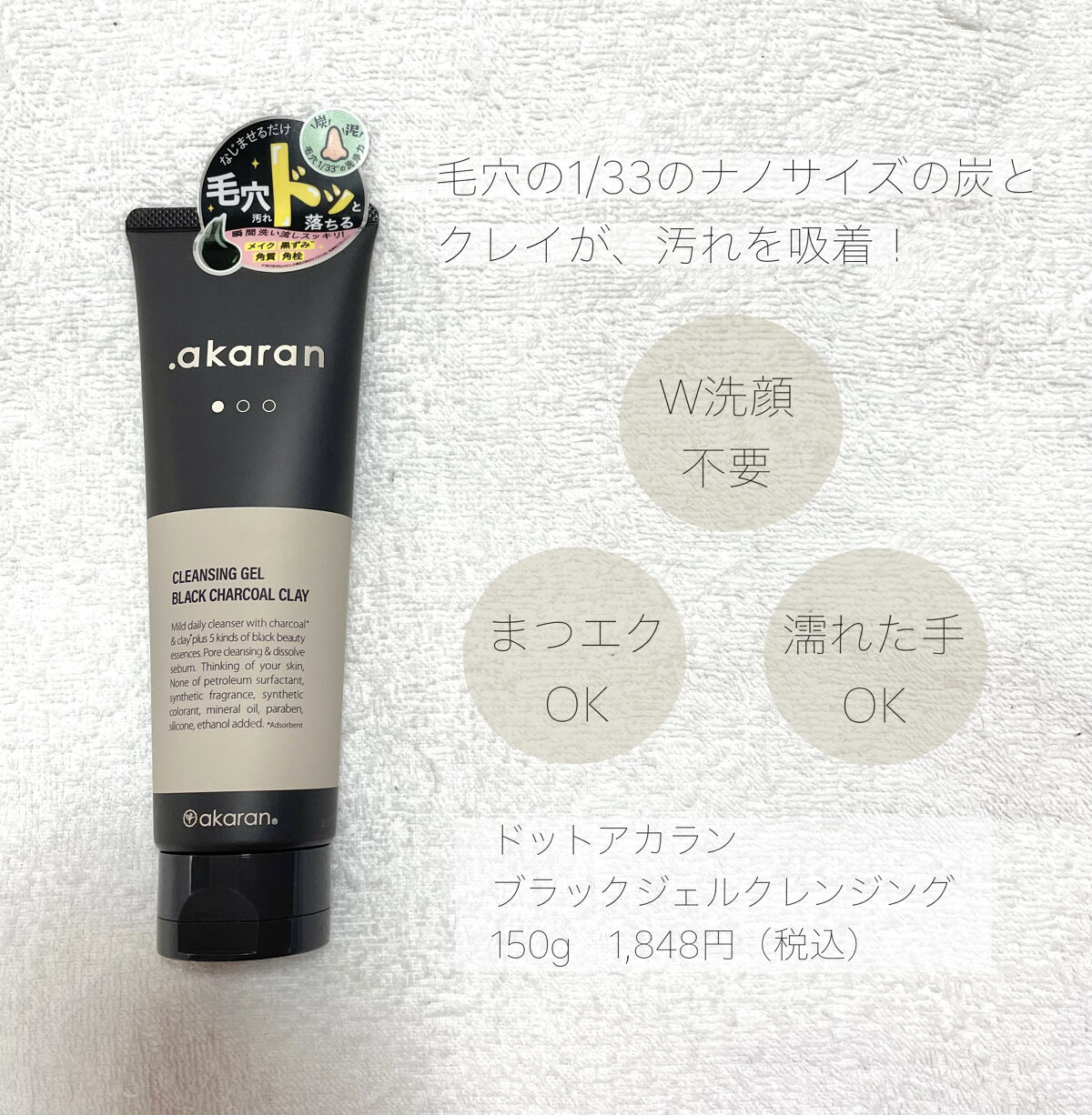 .akaranブラックジェルクレンジング150gドットアカランのクレンジングジェルです✨炭とクレイがメイク汚れをすっきり落としてくれます💕テクスチャーはとろみがありなめらかな感じでした!メイク汚れにすぐ馴染んですっきり汚れを落としてくれました...