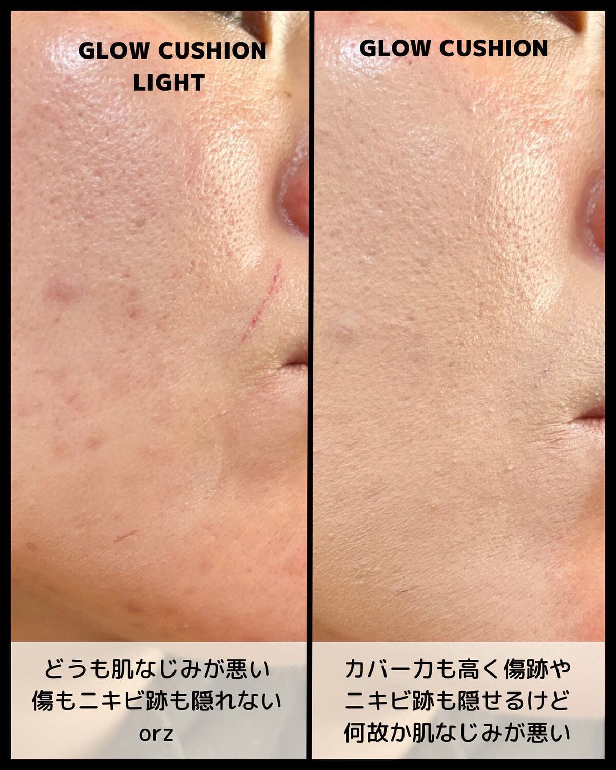 相変わらずの最大72時間のメイク持続力 そして、ツヤも24時間持続してくれる! 皮脂を吸収しやすいパウダー配合で 脂性肌さんでもツヤ肌になれちゃいます♡ 形は他のクッションと同じでたまご型 パフも少し薄めだけどクッション性があります。 そして、気になるマスクのつきづらさ! 家の中で怪しさ満点で6時間ほど マスクして過ごしたところ… 最近、使ったファンデの中で1番 ついてない!! ピンクと何が違うの?と… 見比べて見るとピンクの方がカバー力重視な 部分もあるのでピンク系で少し明るめな気が… でも、レッドが決してカバー力がないわけでは ないのでキレイに仕上がりますよ♡