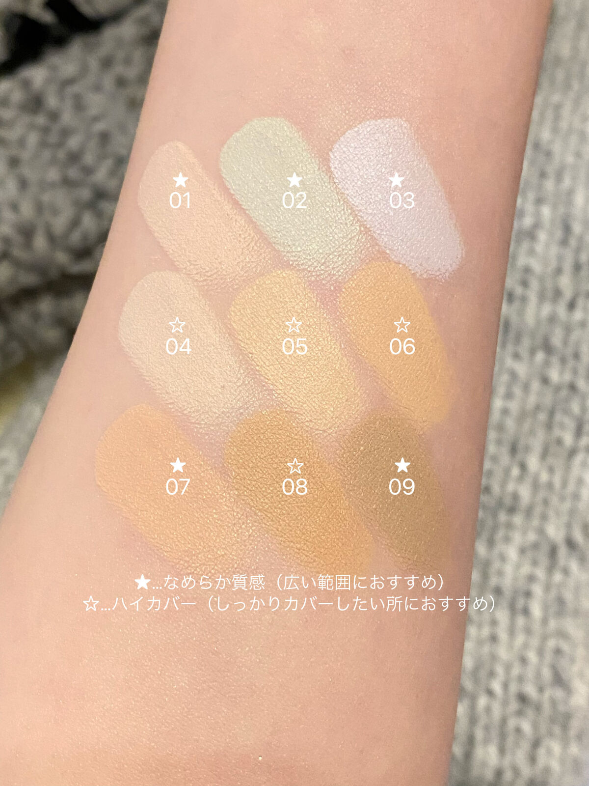 - <01 カバー> 酸化チタン、トリ(カプリル酸/カプリン酸)グリセリル、マイカ、リンゴ酸ジイソステアリル、ポリイソブテン、ビスジグリセリルポリアシルアジペート-2、ヘキサ(ヒドロキシステアリン酸/ステアリン酸/ロジン酸)ジペンタエリスリチル、水添ポリイソブテン、ネオペンタン酸イソデシル、メタクリル酸メチルクロスポリマー、酸化鉄、水添ヒマシ油、パラフィン、オゾケライト、トリイソステアリン酸ポリグリセリル-2、1, 2-ヘキサンジオール、水酸化AI、合成ワックス、ダイマージリノール酸(フィトステリル/イソステアリル/セチル/ステアリル/ベヘニル)、シリカ、(VP/ヘキサデセン)コポリマー、セスキオレイン酸ソルビタン、グンジョウ、メチコン、(エチレン/プロピレン)コポリマー、マイクロクリスタリンワックス、酸化クロム、カプリリルグリコール、スクワラン、カオリン、トコフェロール、水、パンテノール、水添レシチン、BG、セテアリルアルコール、ステアリン酸、ティーツリー葉エキス、ツボクサエキス、セラミドNP、セラミドNS、セラミドAP、セラミドAS、セラミドEOP、コレステロール、フィトスフィンゴシン <02 ミディアムカバー> 酸化チタン、トリ(カプリル酸/カプリン酸)グリセリル、リンゴ酸ジイソステアリル、ポリイソブテン、マイカ、ビスジグリセリルポリアシルアジペート-2、ネオペンタン酸イソデシル、ヘキサ(ヒドロキシステアリン酸/ステアリン酸/ロジン酸)ジペンタエリスリチル、水添ポリイソブテン、酸化鉄、メタクリル酸メチルクロスポリマー、水添ヒマシ油、パラフィン、オゾケライト、トリイソステアリン酸ポリグリセリル-2、1, 2-ヘキサンジオール、水酸化AI、合成ワックス、ダイマージリノール酸(フィトステリル/イソステアリル/セチル/ステアリル/ベヘニル)、シリカ、(VP/ヘキサデセン)コポリマー、セスキオレイン酸ソルビタン、グンジョウ、(エチレン/プロピレン)コポリマー、酸化クロム、マイクロクリスタリンワックス、カプリリルグリコール、メチコン、スクワラン、カオリン、トコフェロール、水、パンテノール、水添レシチン、BG、セテアリルアルコール、ステアリン酸、ティーツリー葉エキス、ツボクサエキス、セラミドNP、セラミドNS、セラミドAP、セラミドAS、セラミドEOP、コレステロール、フィトスフィンゴシン