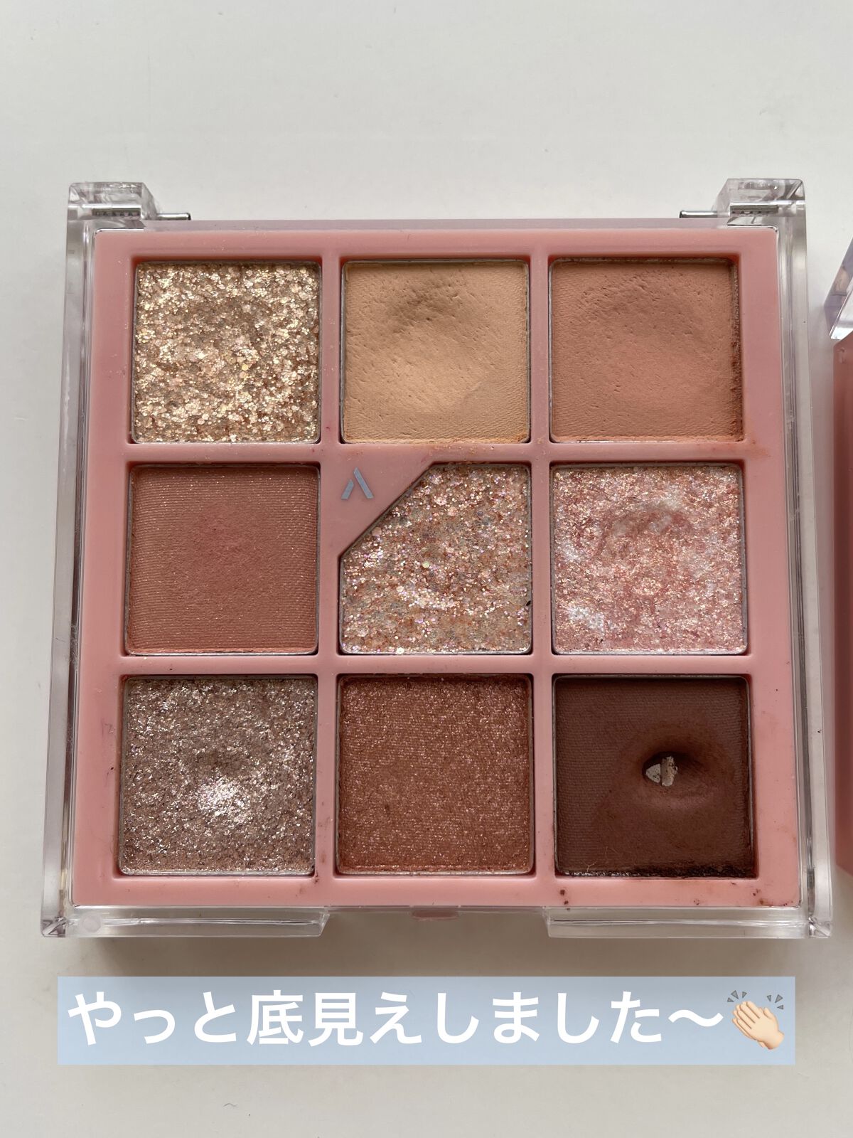 ほぼ毎日使ってるのに鬼のコスパ そして夜になっても落ちないでしっかり残ってる!! 中間色と濃い色を混ぜて使うのが好きだからそこの間を使ってる😂 長く使ってて古いからいつ手放そうか迷ってる、けどまだ使えるんだよなぁ🥹