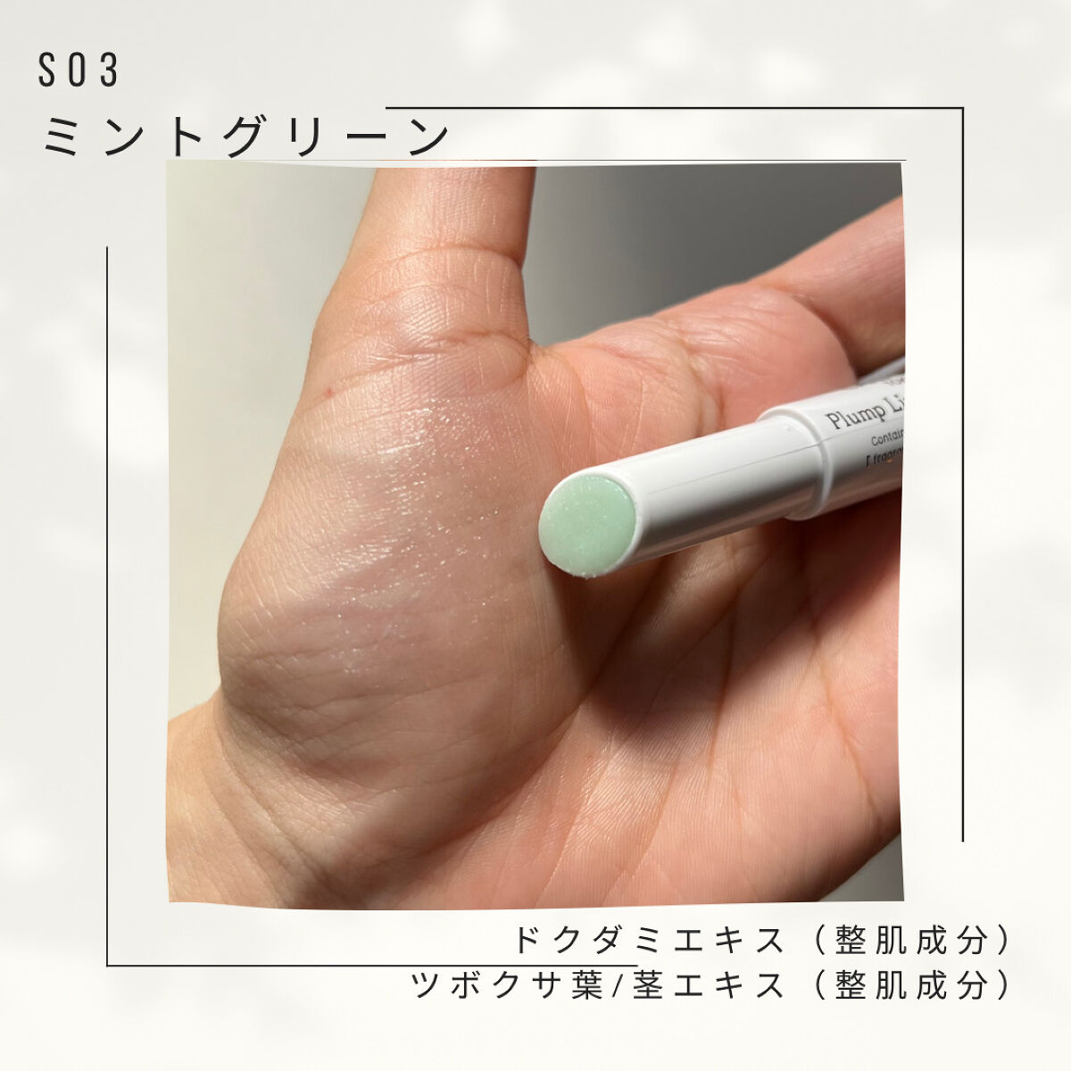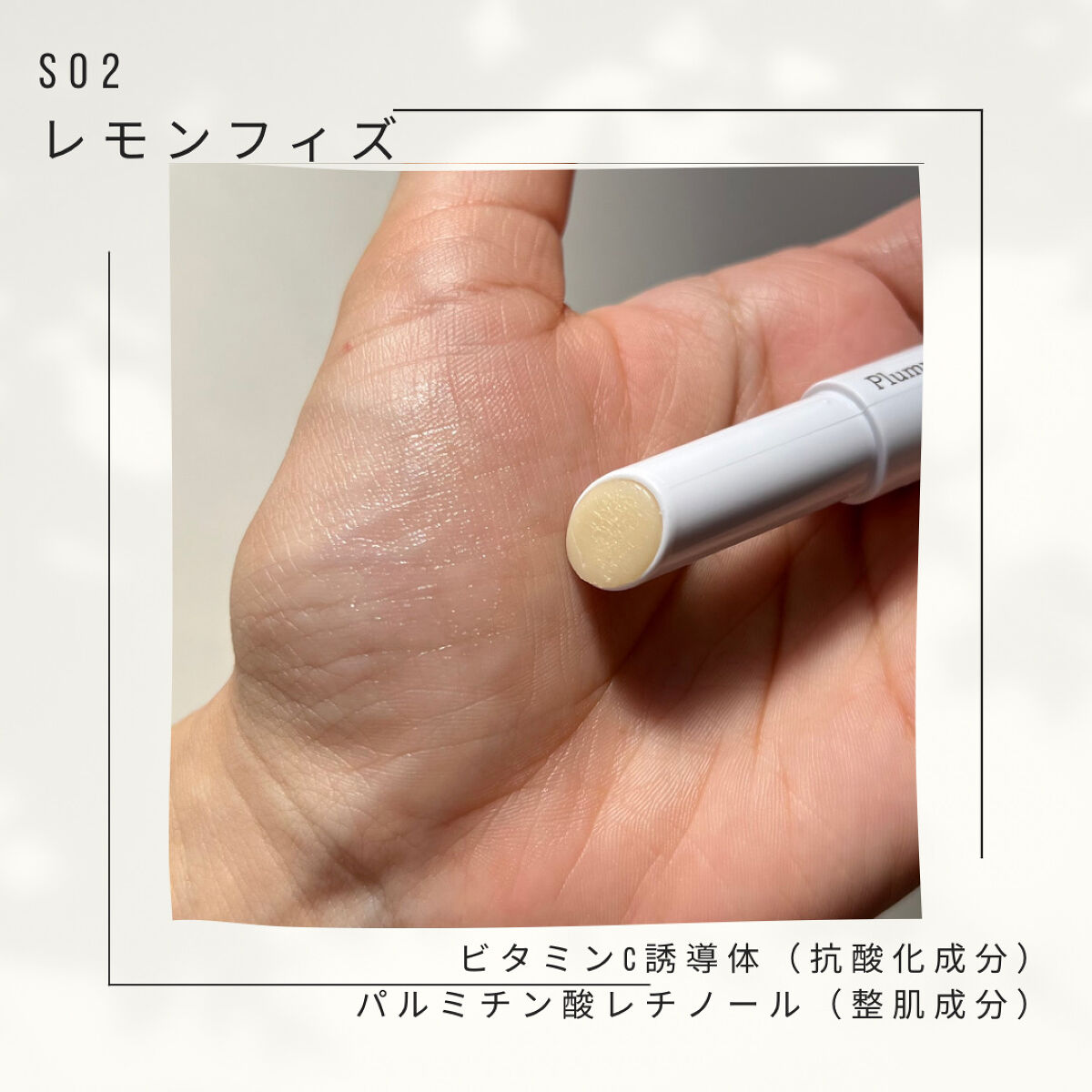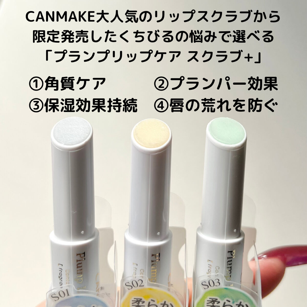 - うれしい成分をプラスした うるおい&角質ケアができるリップスクラブ S01…ヒアルロン酸Na(保湿成分)・セラミドNP(保湿成分) 配合 S02…ビタミンC誘導体(製品の抗酸化成分)・パルミチン酸レチノール(整肌成分) 配合 S03…ドクダミエキス(整肌成分)・ツボクサ葉/茎エキス(整肌成分) 配合 プランプリップケアスクラブに各色2種ずつ成分をプラスしたタイプ。 唇の上で溶けるお砂糖のスクラブが古い角質を優しくオフして、なめらかな唇に整えます。 リップパックした後のような高保湿が持続します。 拭き取り・洗い流し不要なので、外出先でも手軽にケアできます。 ナイトケアにもオススメです。 清涼感のある使い心地 ・スクラブ目的として砂糖の粒子を配合しておりますが、唇の状態によって刺激に感じられる可能性がございますのでご注意ください。 ・強くこすると刺激を感じることがあります。こすりすぎないように注意してください。 ・大変柔らかいバームですので、1㎜程度繰り出してお使いください。 ・一度繰り出したバームは戻りませんのでご注意ください。