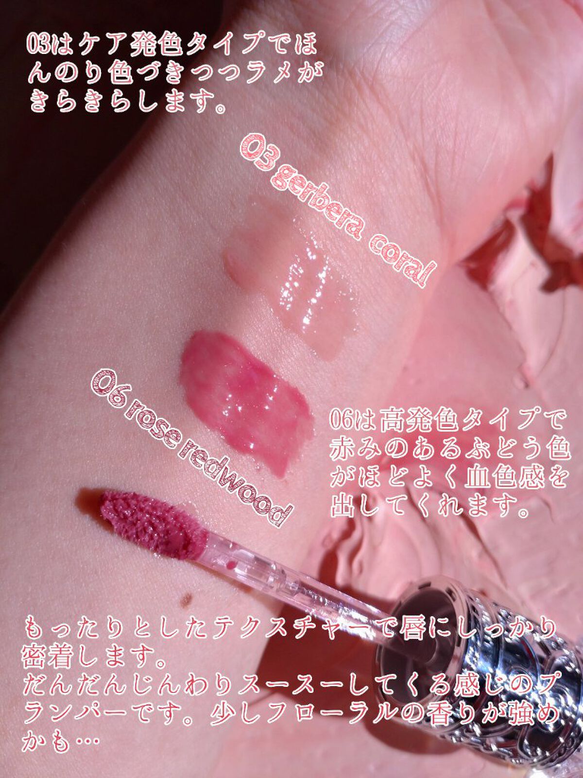 - <01 geranium lilac> ラウロイルグルタミン酸ジ(フィトステリル/オクチルドデシル)、ダイマージリノール酸(フィトステリル/イソステアリル/セチル/ステアリル/ベヘニル)、トリイソステアリン酸ポリグリセリル-2、イソステアリン酸デキストリン、パルミチン酸デキストリン、ポリブテン、(カプリル/カプリン/ミリスチン/ステアリン酸)トリグリセリル、(パルミチン酸/エチルヘキサン酸)デキストリン、テトライソステアリン酸ペンタエリスリチル、スクワラン、エーデルワイス花/葉エキス、オレンジ果汁、クチナシエキス、ダマスクバラ花エキス、トコフェロール、BG、BHT、DPG、(エチレン/プロピレン)コポリマー、クエン酸、グリセリン、シリカ、ジメチコン、トリイソステアリン酸イソプロピルチタン、ハイドロゲンジメチコン、バニリルブチル、メチコン、メントキシプロパンジオール、水、水酸化Al、炭酸Ca、サリチル酸、香料、マイカ、酸化チタン、酸化鉄、黄4、赤202 <02 sweet pea pink> ラウロイルグルタミン酸ジ(フィトステリル/オクチルドデシル)、ダイマージリノール酸(フィトステリル/イソステアリル/セチル/ステアリル/ベヘニル)、トリイソステアリン酸ポリグリセリル-2、イソステアリン酸デキストリン、パルミチン酸デキストリン、ポリブテン、(カプリル/カプリン/ミリスチン/ステアリン酸)トリグリセリル、(パルミチン酸/エチルヘキサン酸)デキストリン、テトライソステアリン酸ペンタエリスリチル、スクワラン、エーデルワイス花/葉エキス、オレンジ果汁、クチナシエキス、ダマスクバラ花エキス、トコフェロール、BG、BHT、DPG、(エチレン/プロピレン)コポリマー、クエン酸、グリセリン、シリカ、ジメチコン、トリイソステアリン酸イソプロピルチタン、ハイドロゲンジメチコン、バニリルブチル、メチコン、メントキシプロパンジオール、水、水酸化Al、炭酸Ca、サリチル酸、香料、マイカ、酸化チタン、酸化鉄、黄4、赤202 <03 gerbera coral> ラウロイルグルタミン酸ジ(フィトステリル/オクチルドデシル)、ダイマージリノール酸(フィトステリル/イソステアリル/セチル/ステアリル/ベヘニル)、トリイソステアリン酸ポリグリセリル-2、イソステアリン酸デキストリン、パルミチン酸デキストリン、ポリブテン、(カプリル/カプリン/ミリスチン/ステアリン酸)トリグリセリル、(パルミチン酸/エチルヘキサン酸)デキストリン、テトライソステアリン酸ペンタエリスリチル、スクワラン、エーデルワイス花/葉エキス、オレンジ果汁、クチナシエキス、ダマスクバラ花エキス、トコフェロール、BG、BHT、DPG、(エチレン/プロピレン)コポリマー、クエン酸、グリセリン、シリカ、ジメチコン、トリイソステアリン酸イソプロピルチタン、ハイドロゲンジメチコン、バニリルブチル、ホウケイ酸(Ca/Na)、メチコン、メントキシプロパンジオール、酸化スズ、水、水酸化Al、炭酸Ca、サリチル酸、香料、酸化チタン、酸化鉄、黄4、赤202 <04 carnation blush> ラウロイルグルタミン酸ジ(フィトステリル/オクチルドデシル)、ダイマージリノール酸(フィトステリル/イソステアリル/セチル/ステアリル/ベヘニル)、トリイソステアリン酸ポリグリセリル-2、イソステアリン酸デキストリン、パルミチン酸デキストリン、ポリブテン、(カプリル/カプリン/ミリスチン/ステアリン酸)トリグリセリル、(パルミチン酸/エチルヘキサン酸)デキストリン、テトライソステアリン酸ペンタエリスリチル、スクワラン、エーデルワイス花/葉エキス、オレンジ果汁、クチナシエキス、ダマスクバラ花エキス、トコフェロール、BG、BHT、DPG、(エチレン/プロピレン)コポリマー、クエン酸、グリセリン、シリカ、ジメチコン、トリイソステアリン酸イソプロピルチタン、ハイドロゲンジメチコン、バニリルブチル、メチコン、メントキシプロパンジオール、水、水酸化Al、炭酸Ca、サリチル酸、香料、マイカ、酸化チタン、酸化鉄、黄4、赤202 <05 lily fuchsia> ラウロイルグルタミン酸ジ(フィトステリル/オクチルドデシル)、ダイマージリノール酸(フィトステリル/イソステアリル/セチル/ステアリル/ベヘニル)、トリイソステアリン酸ポリグリセリル-2、イソステアリン酸デキストリン、パルミチン酸デキストリン、ポリブテン、(カプリル/カプリン/ミリスチン/ステアリン酸)トリグリセリル、(パルミチン酸/エチルヘキサン酸)デキストリン、テトライソステアリン酸ペンタエリスリチル、スクワラン、エーデルワイス花/葉エキス、オレンジ果汁、クチナシエキス、ダマスクバラ花エキス、トコフェロール、BG、BHT、DPG、(エチレン/プロピレン)コポリマー、クエン酸、グリセリン、シリカ、ジメチコン、トリイソステアリン酸イソプロピルチタン、ハイドロゲンジメチコン、バニリルブチル、メチコン、メントキシプロパンジオール、水、水酸化Al、炭酸Ca、サリチル酸、香料、マイカ、酸化チタン、酸化鉄、黄4、赤202 <06 rose redwood> ラウロイルグルタミン酸ジ(フィトステリル/オクチルド