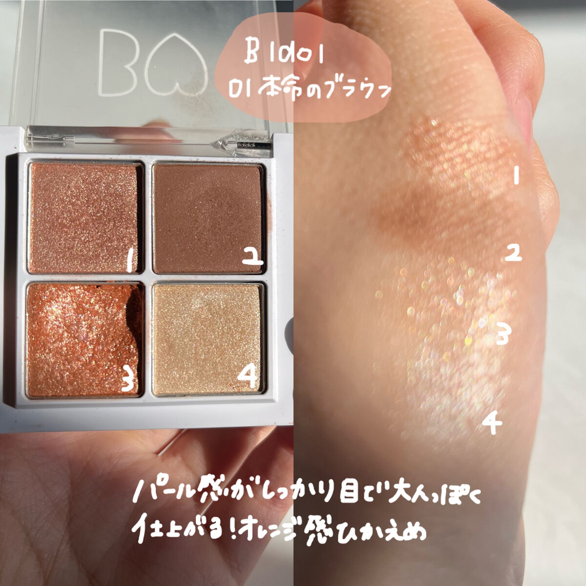 ピンクブラウンのアイシャドウパレットになりますが、私はあまりピンク感を感じませんでした。 ラメはギラギラのラメ!ではなく優しくキラキラするといった感じでしょうか♡ 秋冬に使いたくなるアイシャドウパレットです♪