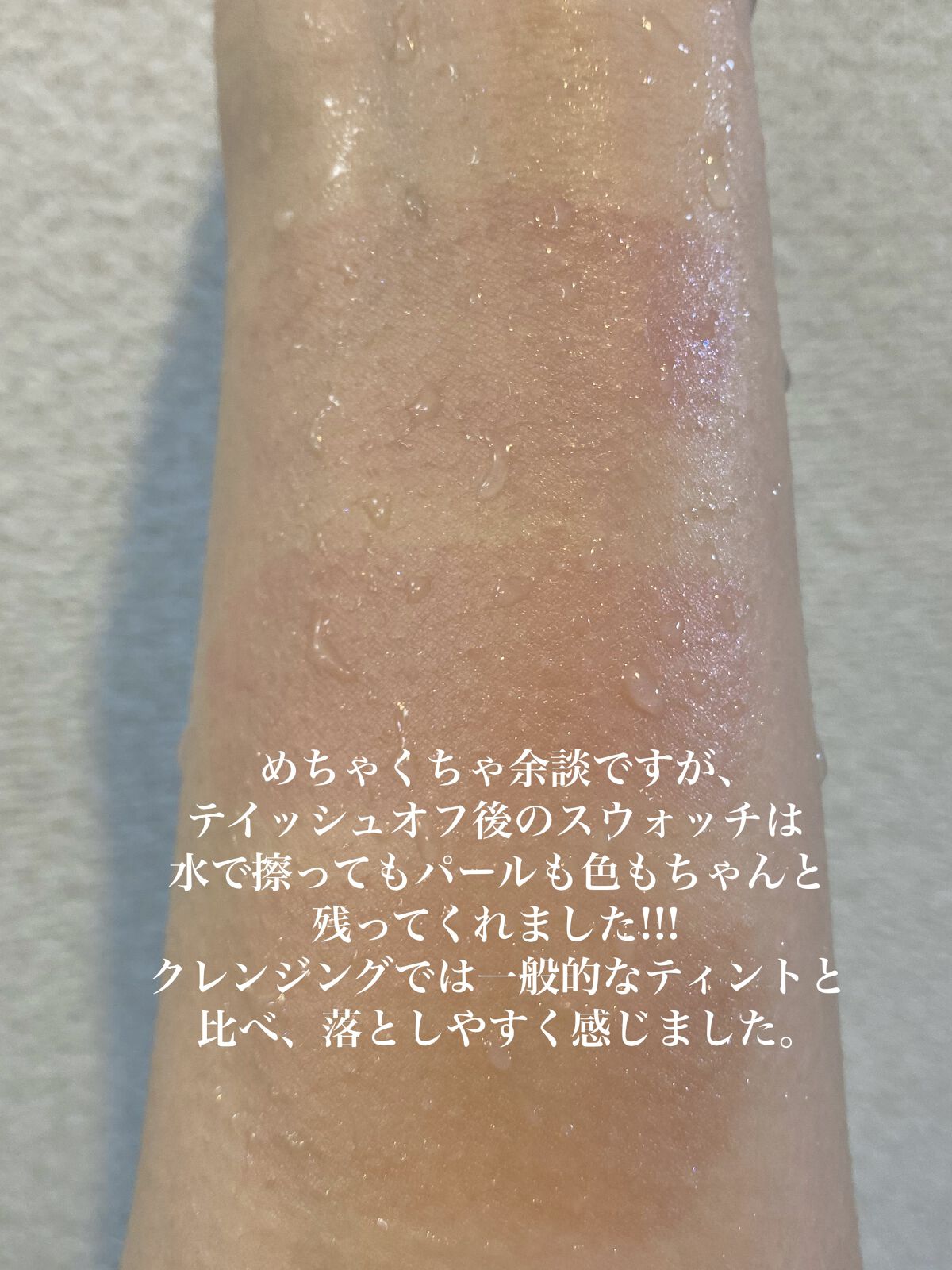 トーンアップするか否かの確認が漏れていて、無色透明のつもりで購入。開封時にパッケージを見てトーンアップやん!?!?となりました。しかしトーンアップと言っても艶で明るく見える程度の仕上がりで好みでした。 無色透明の方がベースメイク前に仕込むのに使いやすく、そのまま首やボディも塗れちゃうので手軽なんですよね。 塗りたては少しべたつくものの、時間が経つとベタつきは感じずしっとりとした触り心地に。