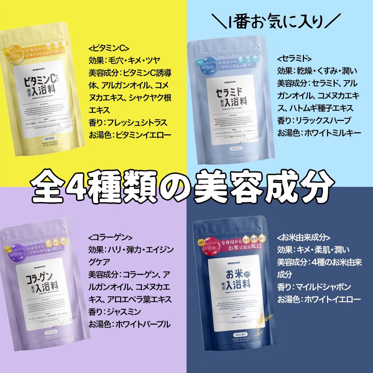 超ショック!! 夏から、amproom(アンプルーム)の入浴剤をコツコツ買いためていざ紹介しようとpostを作っていたら、なんと……「amproomのブランドが2025年2月28日で終了」されるらしいです(T_T)。 お米入浴料 4種類のコメ由来成分*¹配合の入浴料。▶︎ キメ(キメを整える)▶︎ 柔肌(肌を柔らげる)▶︎ 潤い コラーゲン入浴料 コラーゲン*²に加え、アルガンオイル*³、コメヌカエキス、アロエベラ葉エキスという4種類の保湿成分配合の入浴料。▶︎ ハリ ▶︎ 弾力 ▶︎ 潤い