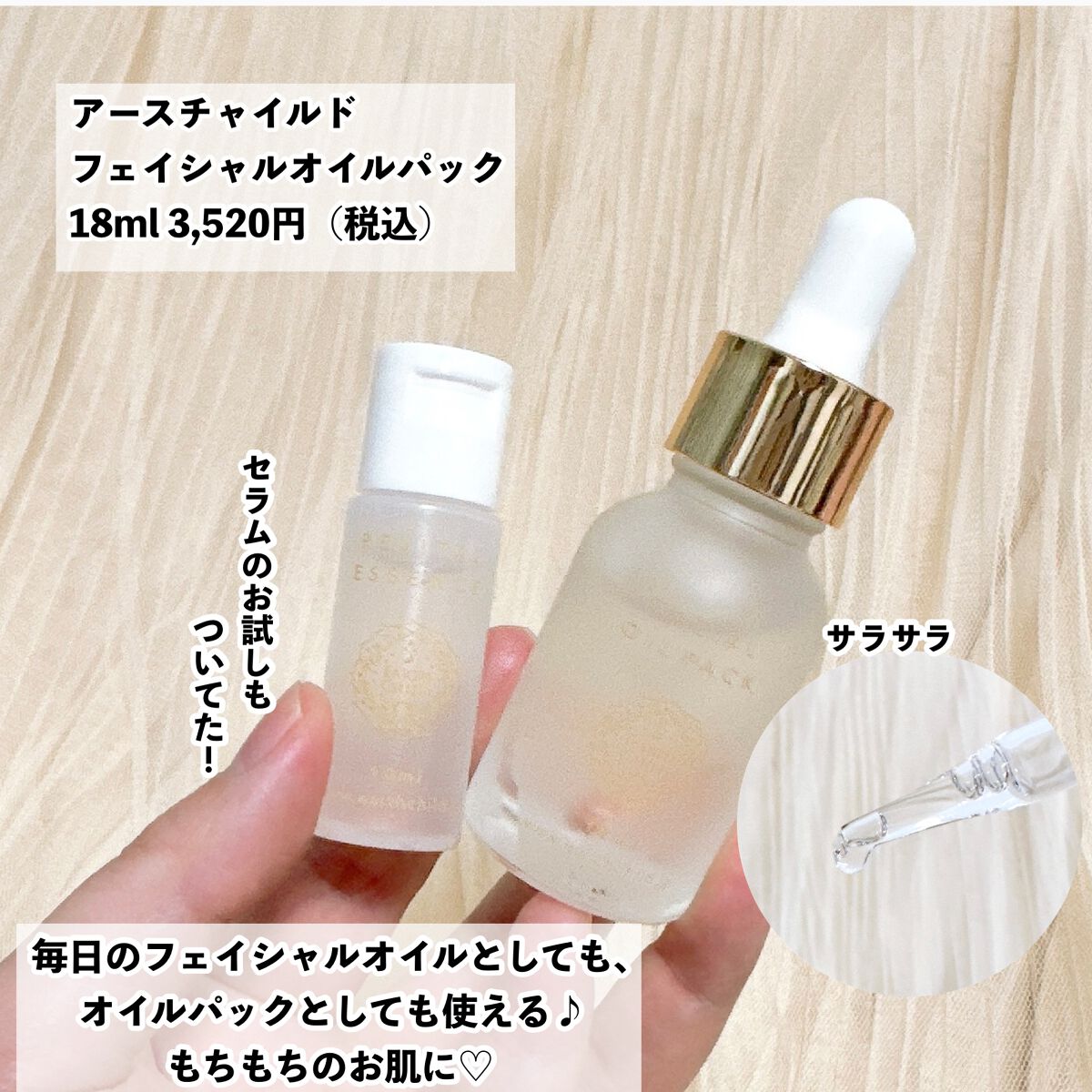 コエタスのモニターキャンペーンで頂いた、アースチャイルドフェイシャルオイルパックのレビューです♡こちらのオイル、成分がたったの2つというとってもシンプルな処方。天然由来のうるおい成分「オレンジラフィーオイル」と、ビタミンEの一種である「トコト...