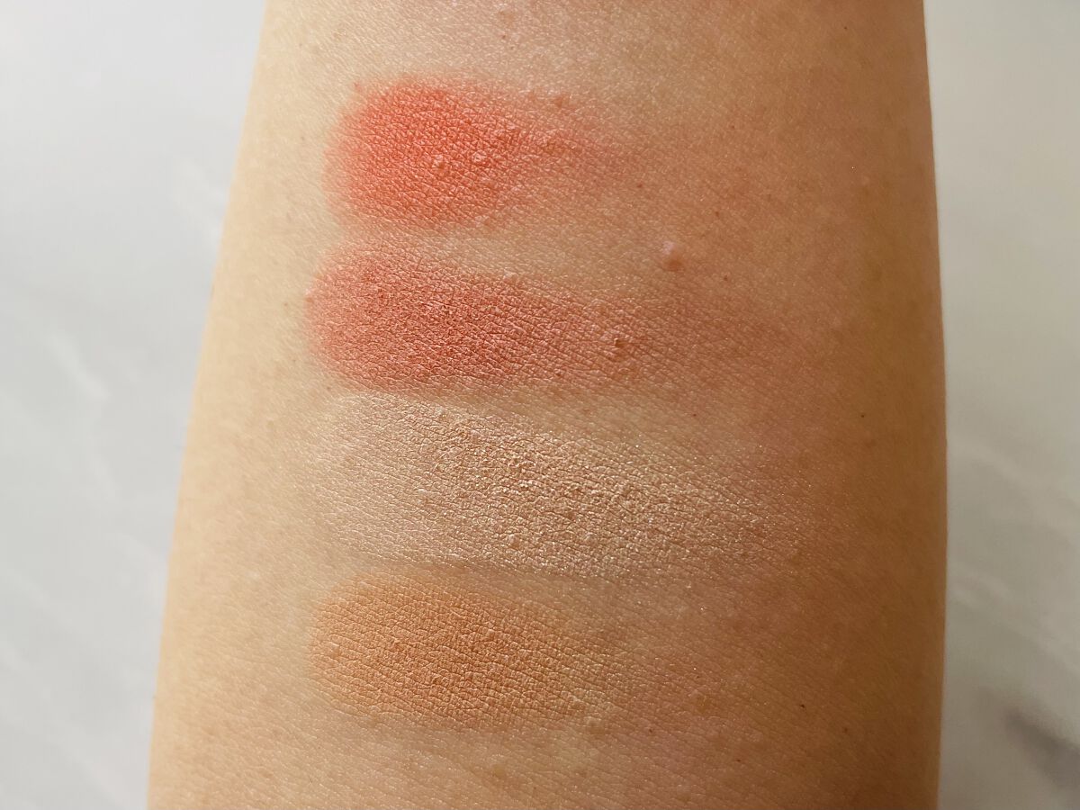 - 3つのチークとハイライターが1つになったマルチパレット ひとつで何通りものフィニッシュが楽しめる、便利なアイテム。 チークとハイライターのブレンド次第で、ほんのりから華やかな⾎⾊感まで、いろいろなメイクが楽しめます。 1.ひとつのパレットに3つのチークとハイライターがIN 2.マイクロ微粒⼦パウダーだから、ふわっとムラなく、肌に密着! 3.フレッシュな⾎⾊感で「美肌⾒え」 4.植物由来の保湿成分* 配合 ※紙製パッケージ⼊り * 保湿成分:スクワラン、シア脂、メドウフォーム種⼦油