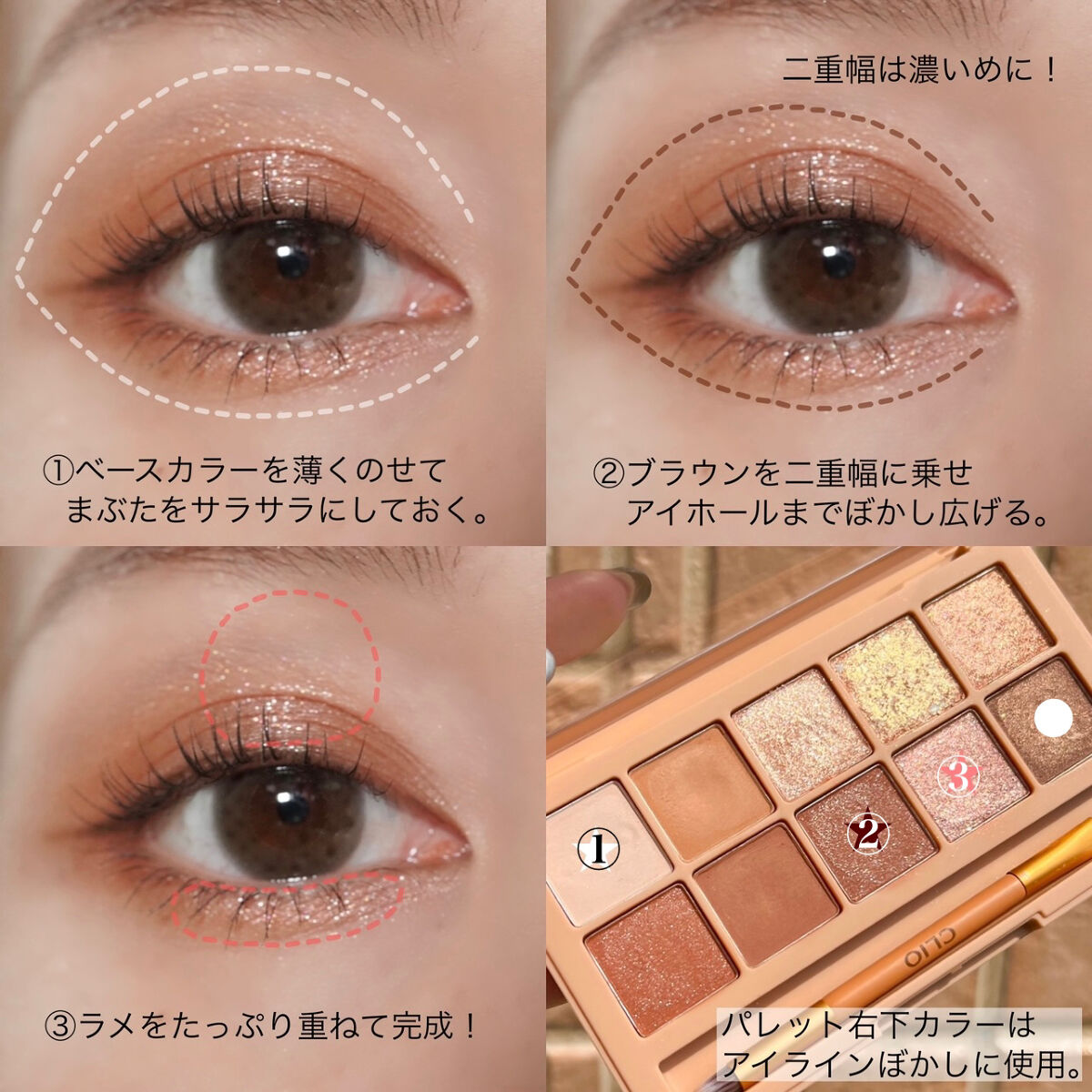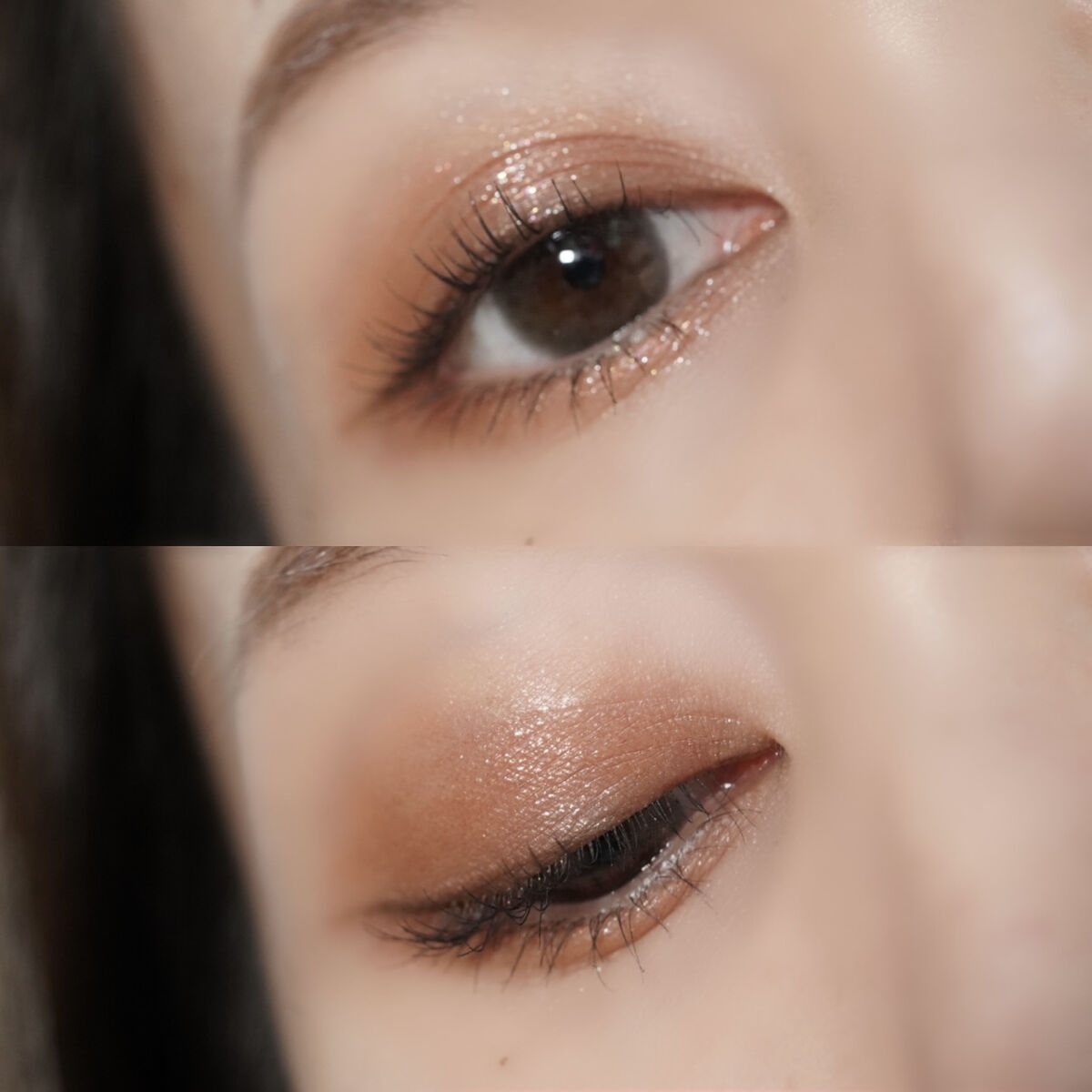 よくパレットのなかで明るいカラーをベースにまぶたに広く塗ることが多いのですが、パール感のあるカラーを避ける🙆♀️! パール感たっぷりの明るいカラーは涙袋に使うぐらい光を集めてぷっくり見せてくれるので、まぶたに広く使うと腫れぼったく見えがち😓 目元を明るくみせてくれたり、次に使うアイシャドウをぼかしやすくしてくれるけど、すっ飛ばしてメインのカラーを塗っちゃう✊🏻❤️🔥 涙袋にはたっぷり塗ってぷっくり見せる🙆♀️💕 シルキースフレアイズのマットタイプはすごく優れているな〜と感じました☺️💗 赤やオレンジなどは、入れすぎると腫れぼったく見えやすいので、見せたいカラーは下まぶた目尻にのせて色をたのしむ♡♡ パール感なしの透けマットだけじゃ物足りない… そう感じさせない華やかなラメが左上に入っているので黒目上と涙袋にのせるとすごく可愛い仕上がりに😍! 厄介な左右差のお陰でマットアイシャドウが好きになりました😌💕