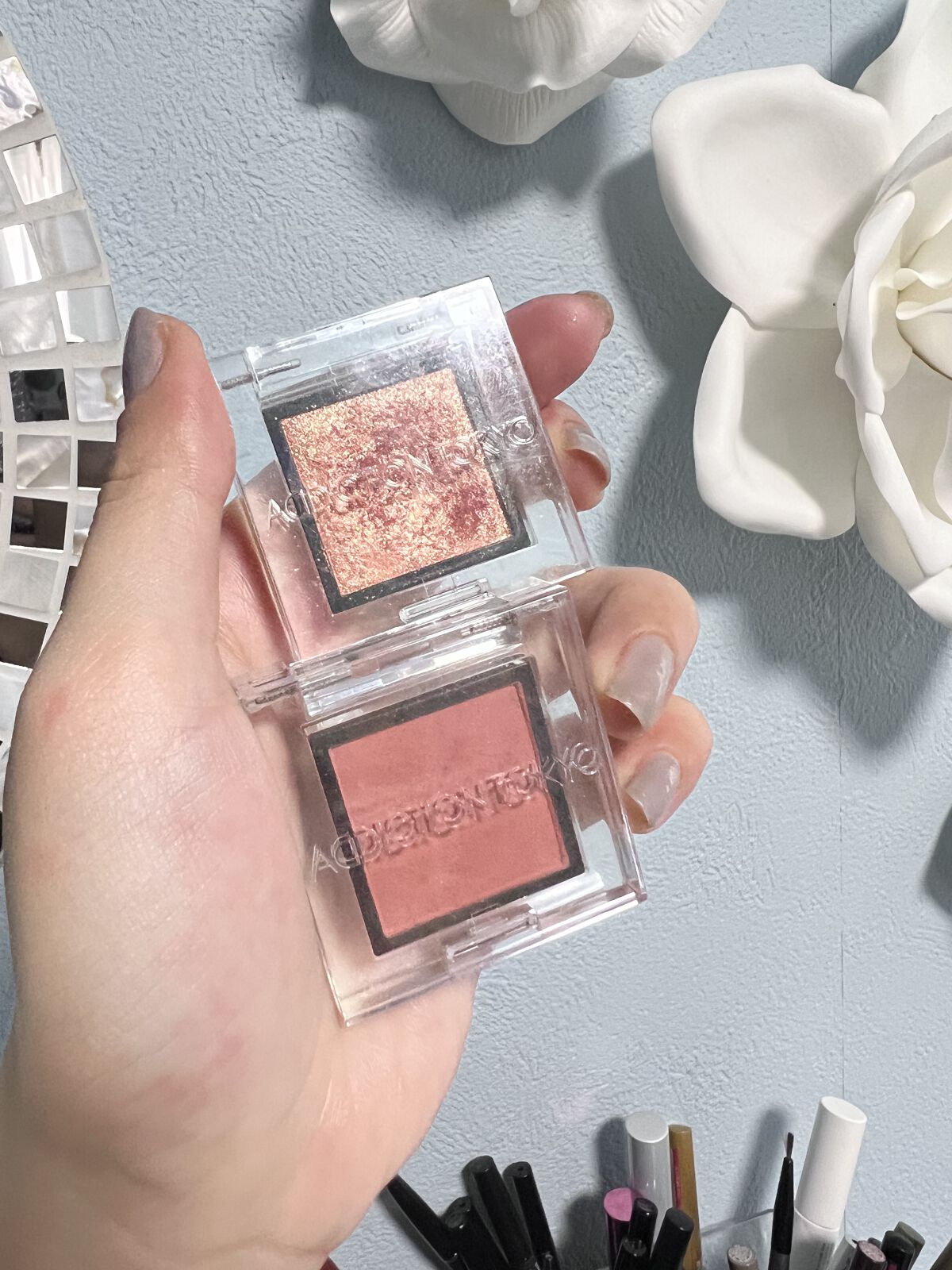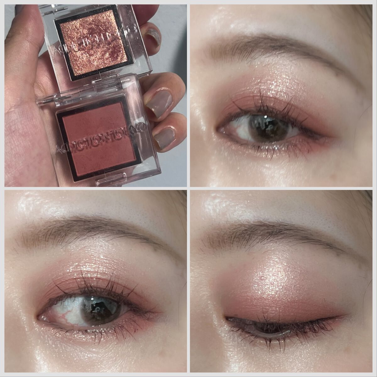 ボビイブラウンの名品ムーンストーンはベースがクリアなのでどんなアイシャドウにも合わせられるし上からトッピングするのにも向いています。 アディクションのマリアージュは2,200円でこの煌めき! 一番安いのに一番輝く、さすがです。 秋蛍は実はトッピングするとベースのシャドウを殺してしまうので目頭、下瞼などポイント使いかベースに使うのがおすすめです。