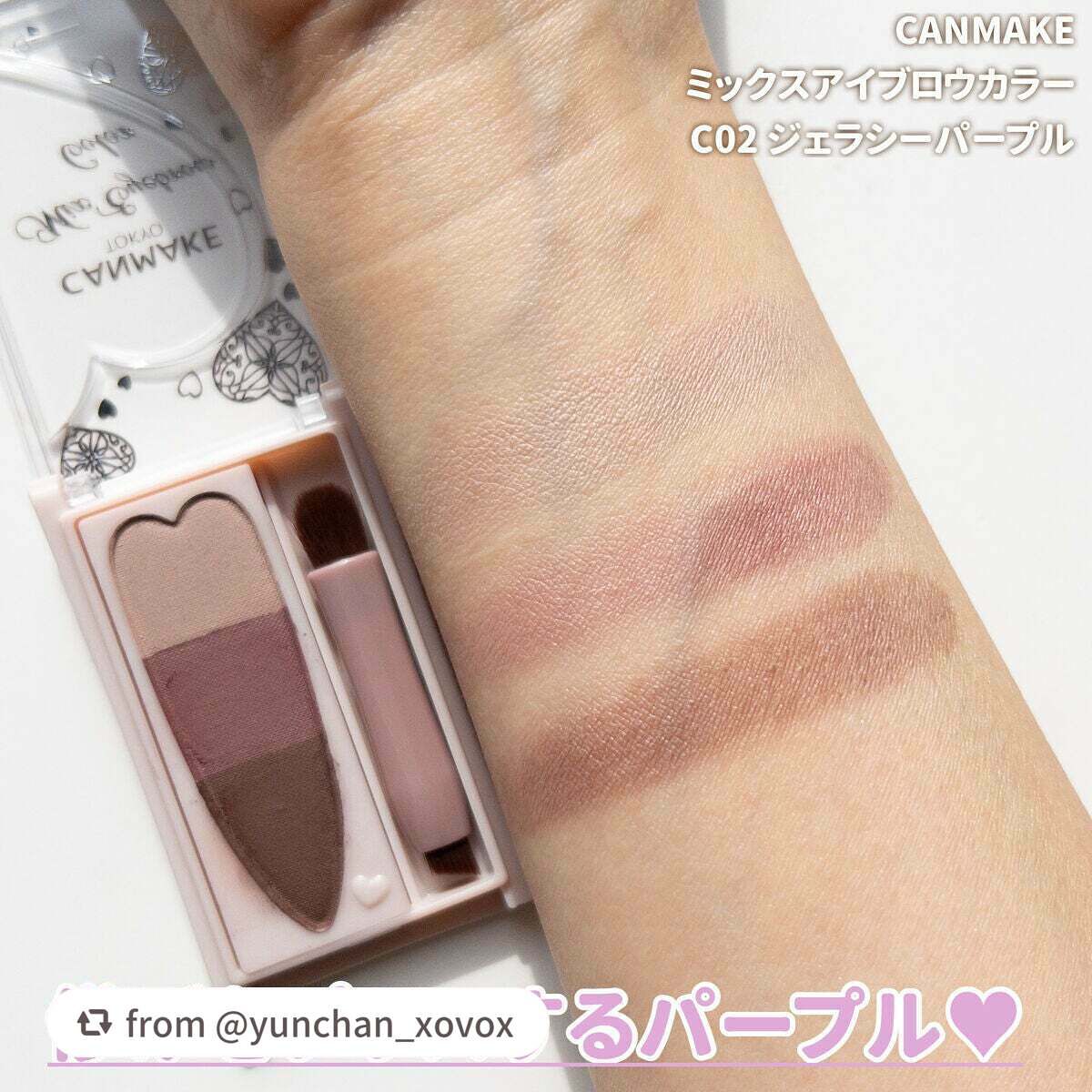 - ベーシック眉もトレンド眉も叶う!ニュアンスカラーがかわいいアイブロウパウダー カラー眉って流行っているけど難しそう…という方でも大丈夫! 3色の色味をブレンドすることで、自分好みのカラー感に調整が可能です。 ほんのりニュアンスがかわいいナチュラル眉も、 トレンド感たっぷりのオシャレなカラー眉も、 このパレット1つで自由自在につくることができます♡ 肌温度で溶ける半固形状のアロエバターコート粉体※が 眉にピタッと密着!仕上がりしっかりキープ✨ ※アロエベラ葉エキス・ヤシ油 ◆水・汗・皮脂に強い