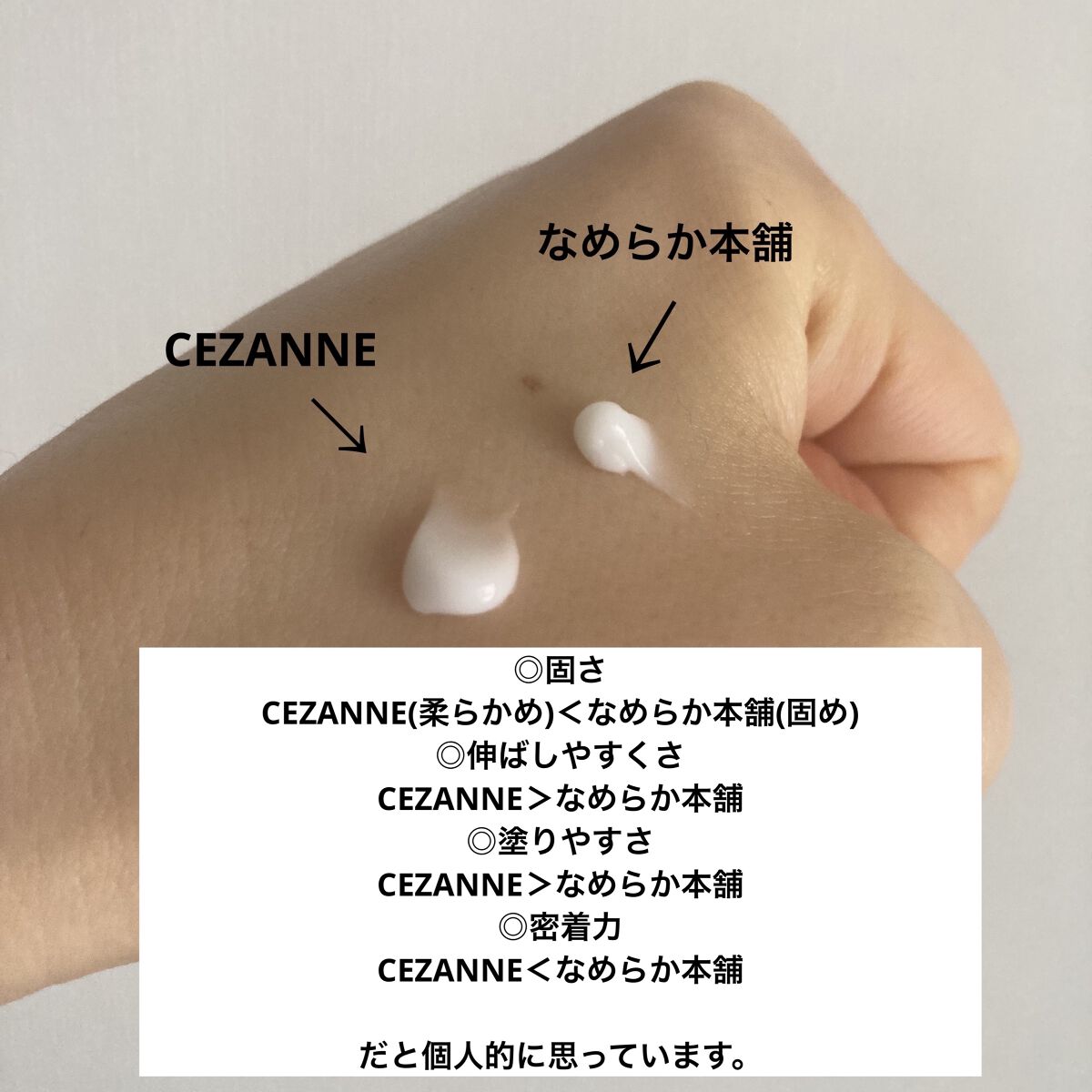 CEZANNEはテクスチャーが柔らかめなため、伸ばしやすく、ぬりやすいので肌に溶け込みやすい気がします。 なめらか本舗は密着力が高い分、アイメイクがよれやすくて、朝使用してなかったので、朝晩使用しやすいCEZANNEの方が私は好きでした😊 使用頻度が高いからか、冬になり保湿力高いスキンケアをしているからかはわかりませんが、シワへの効果も若干ですが、CEZANNEの方が高いような🤔